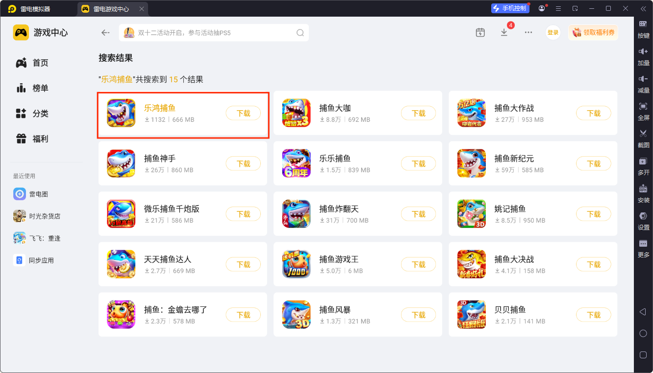 《乐鸿捕鱼》有3D逼真画面,鱼种丰富还有远古BOSS挑战,升级就能解锁免费VIP,福利多门槛低。在这里小编推荐用雷电模拟器玩,模拟器里有几百种游戏供大家选择,而且也有该游戏的预约下载渠道,大家只需要在内置的雷电游戏中心搜索“乐鸿捕鱼”下载即可。