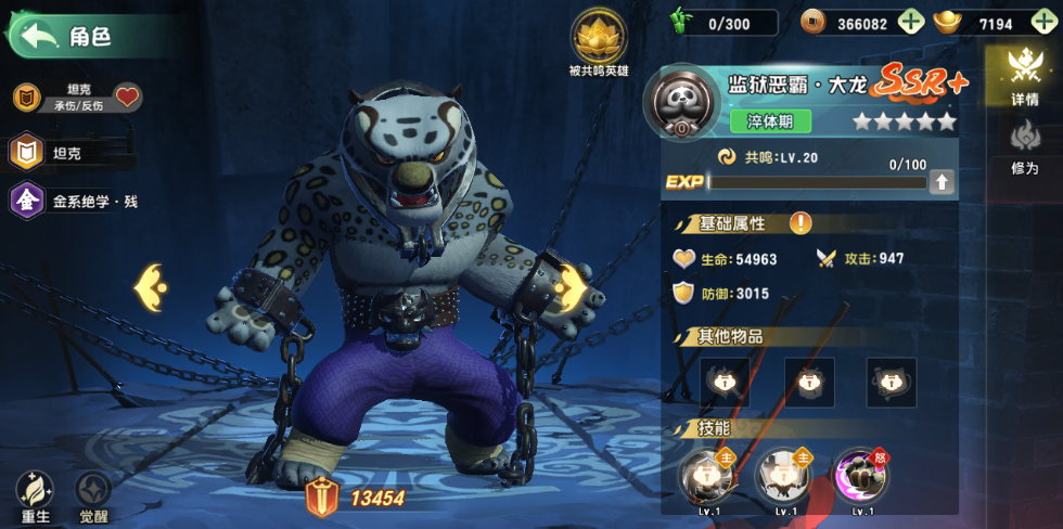 SSR+级反伤承伤坦克,土系绝学。大龙不仅能扛,还能把伤害弹回去,让打他的人自己先疼。
