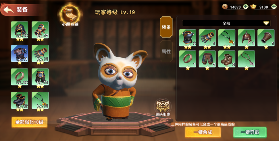 3.升级装备:装备升级可提升玩家战力,每强化一次可随机加强一条属性(生命、攻击、防御作用于所有英雄)