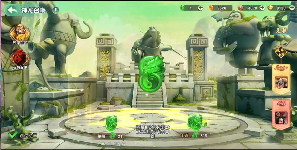 开启神龙召唤后可选择UR以及SSR+进行许愿召唤,10连抽需要十个八卦灵玉(八卦灵玉可用元宝购买以及商场购买,招募还可获得心愿卷)R品质概率为12%