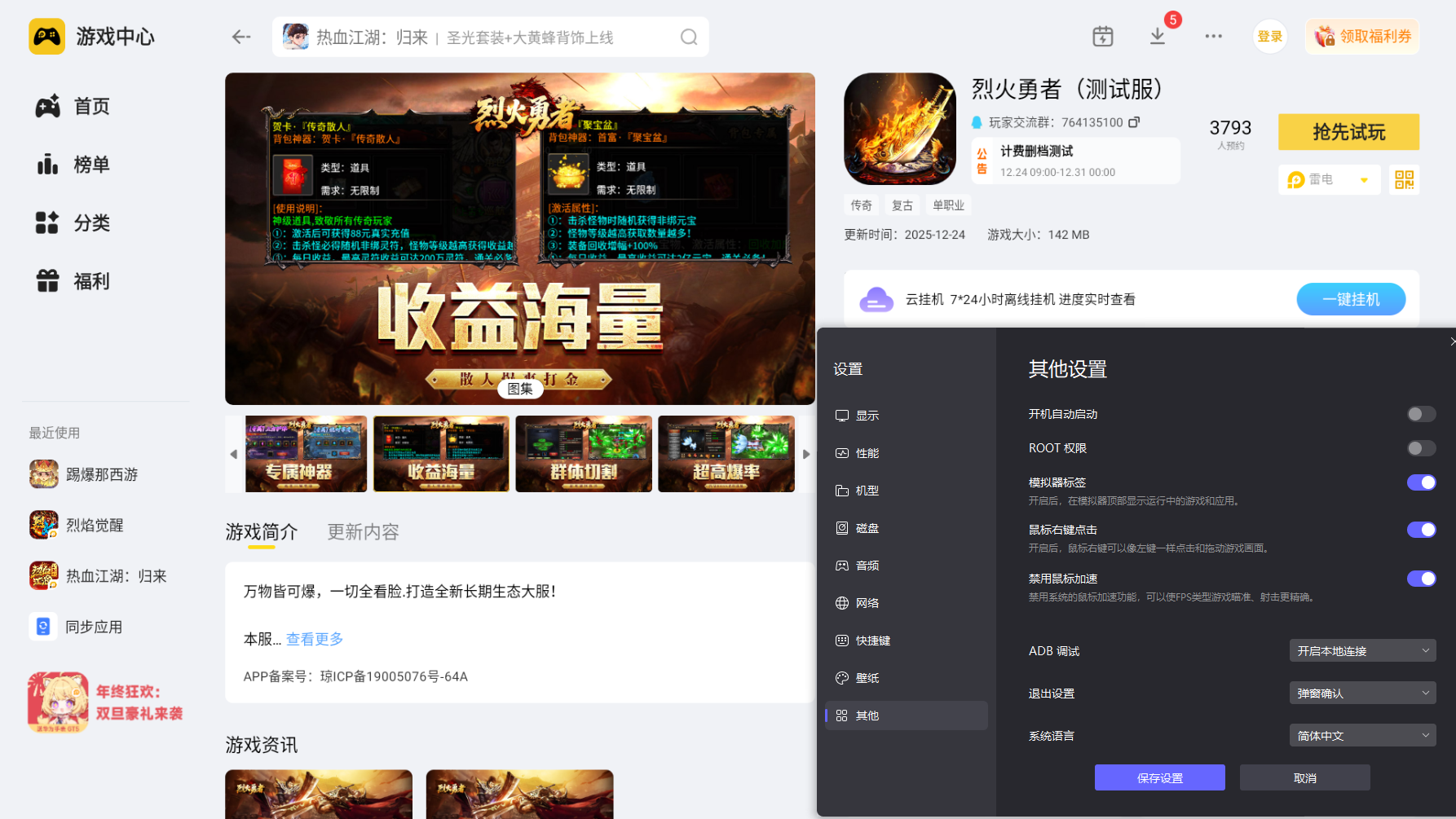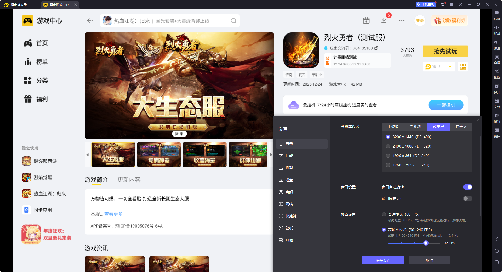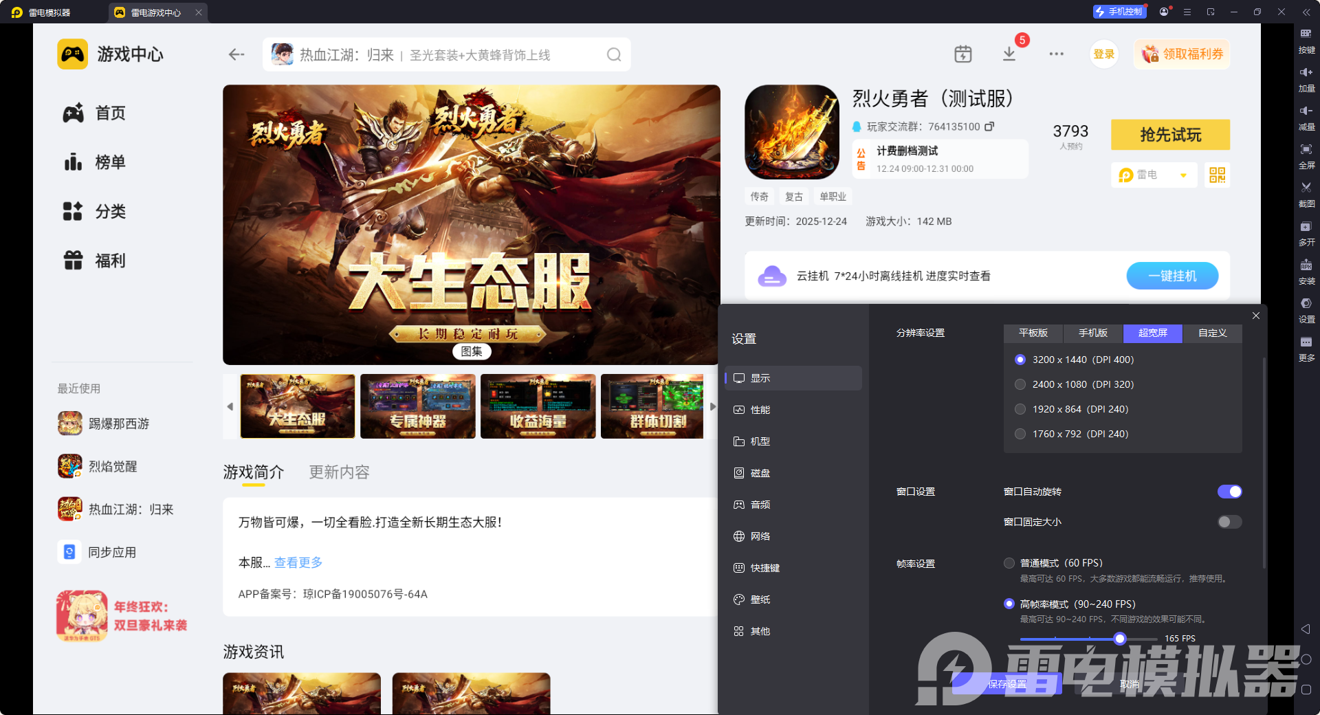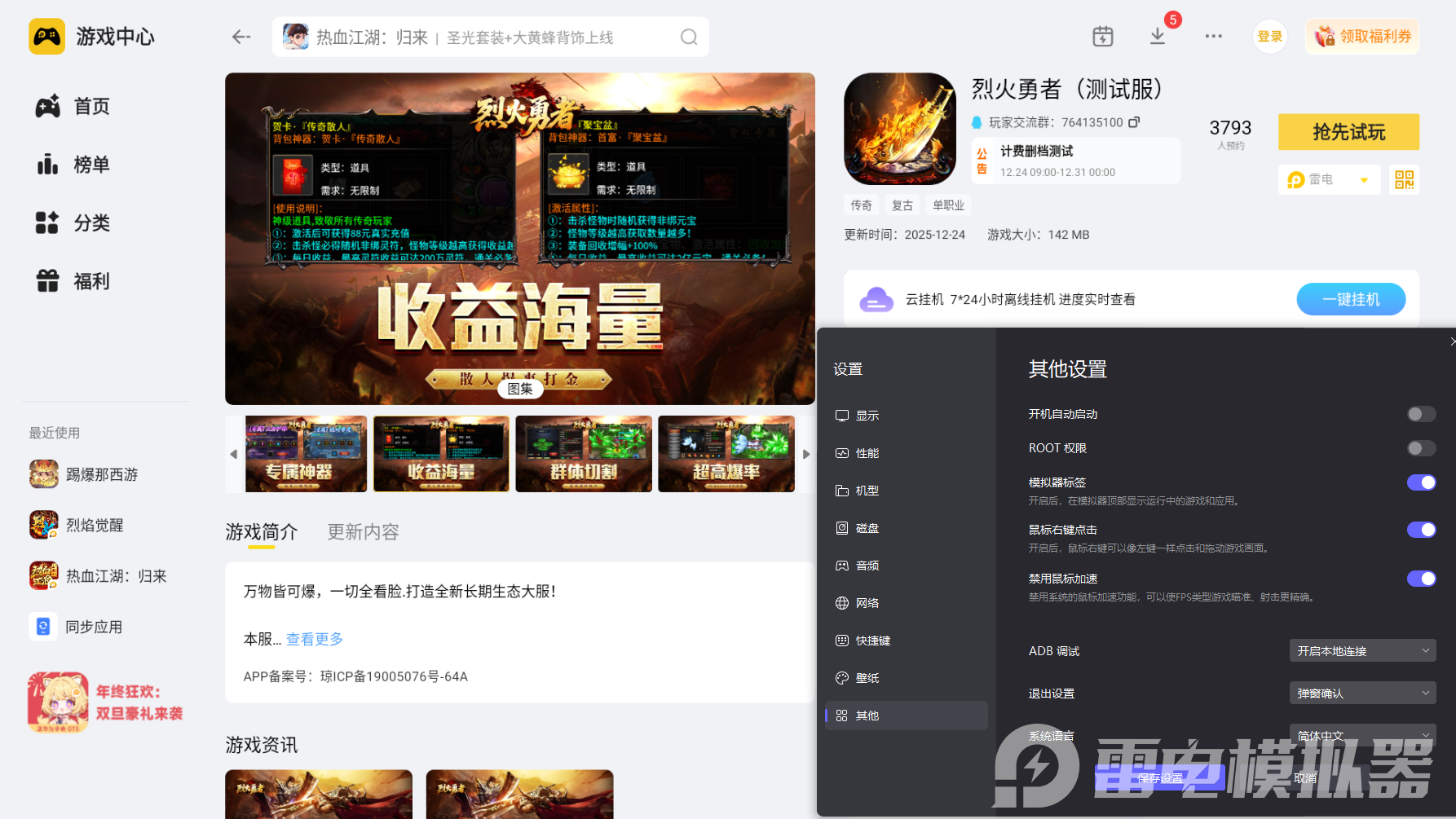 《烈火勇者》主打高攻速切割、全地图爆装,还有深度探索的梯度地图和爽快PVP玩法。这些特色需要稳定的运行环境才能尽显魅力,而雷电模拟器刚好能精准适配,既不改变游戏本身的核心乐趣,还能通过电脑配置放大玩法优势,让刀刀暴击的打击感、光柱满屏的视觉冲击都原汁原味呈现。