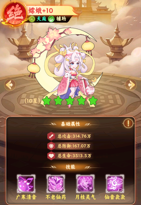 攻击+20%、防御+20%,攻击时为攻击力最高的一个己方回复20%嫦娥攻击的生命并使其暴击+5%,该效果可叠加2次,持续3秒。
