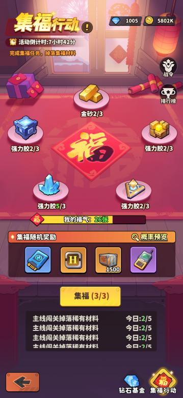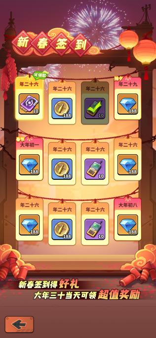 · 春节活动期间,每天参与各种玩法,可获得合成【福】的各种材料,所有材料分别集齐3个可合成1个【福】,获得奖励!