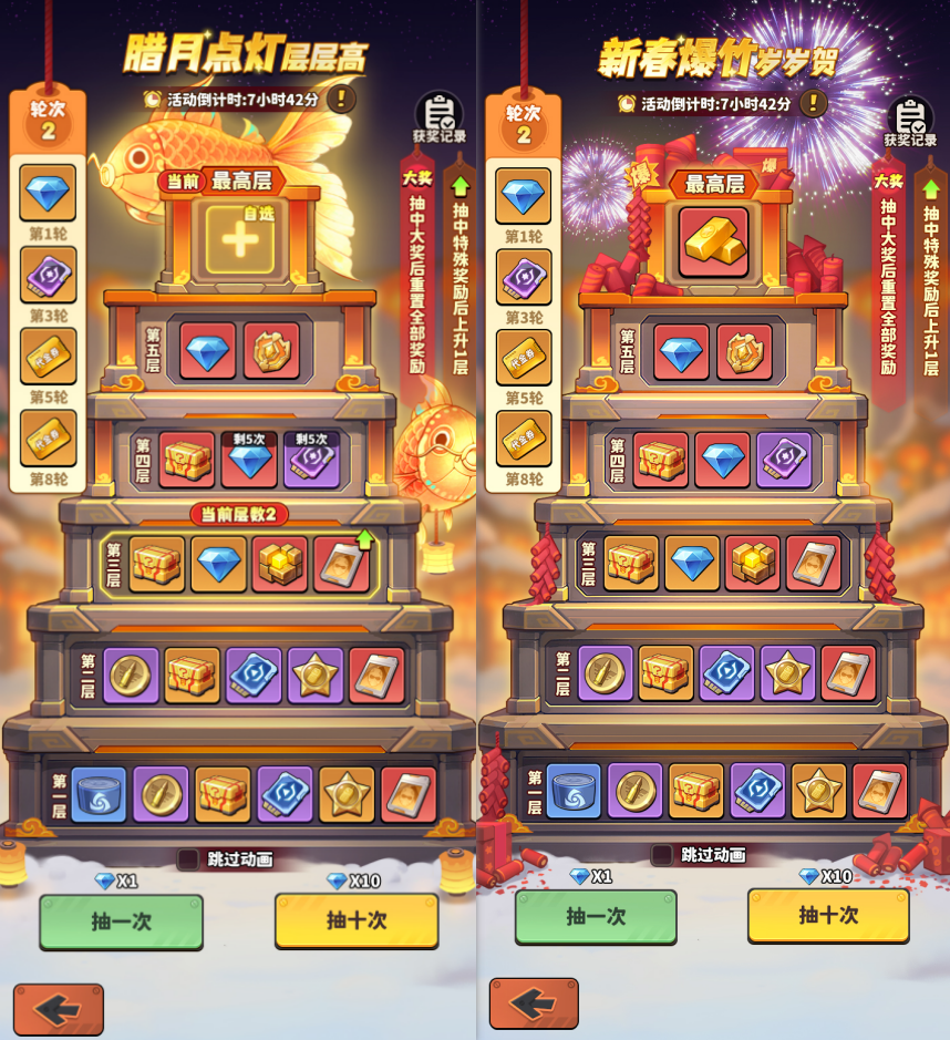 · 从第一层开始抽奖,抽到指定道具可提升一层,层数越高,奖励越好。抽中最高层的大奖后,将回到第一层。