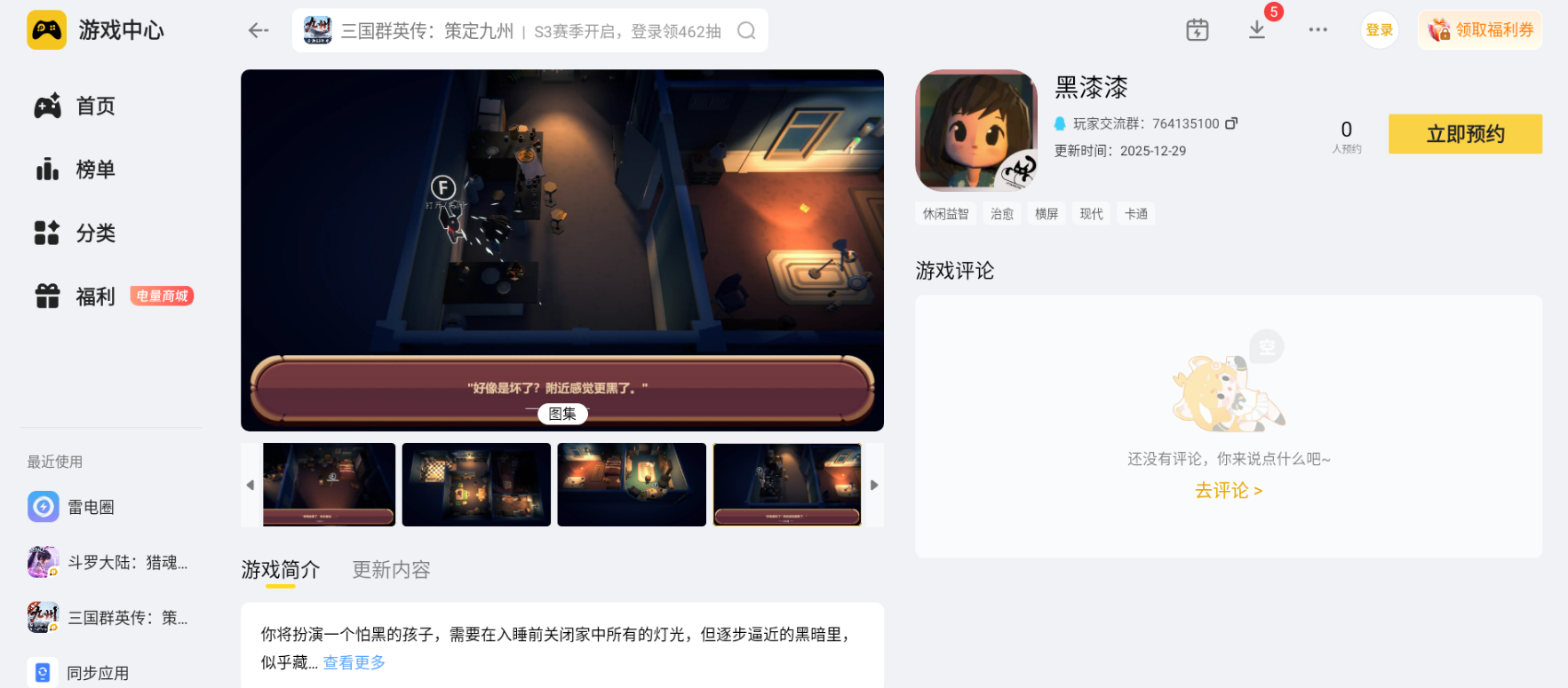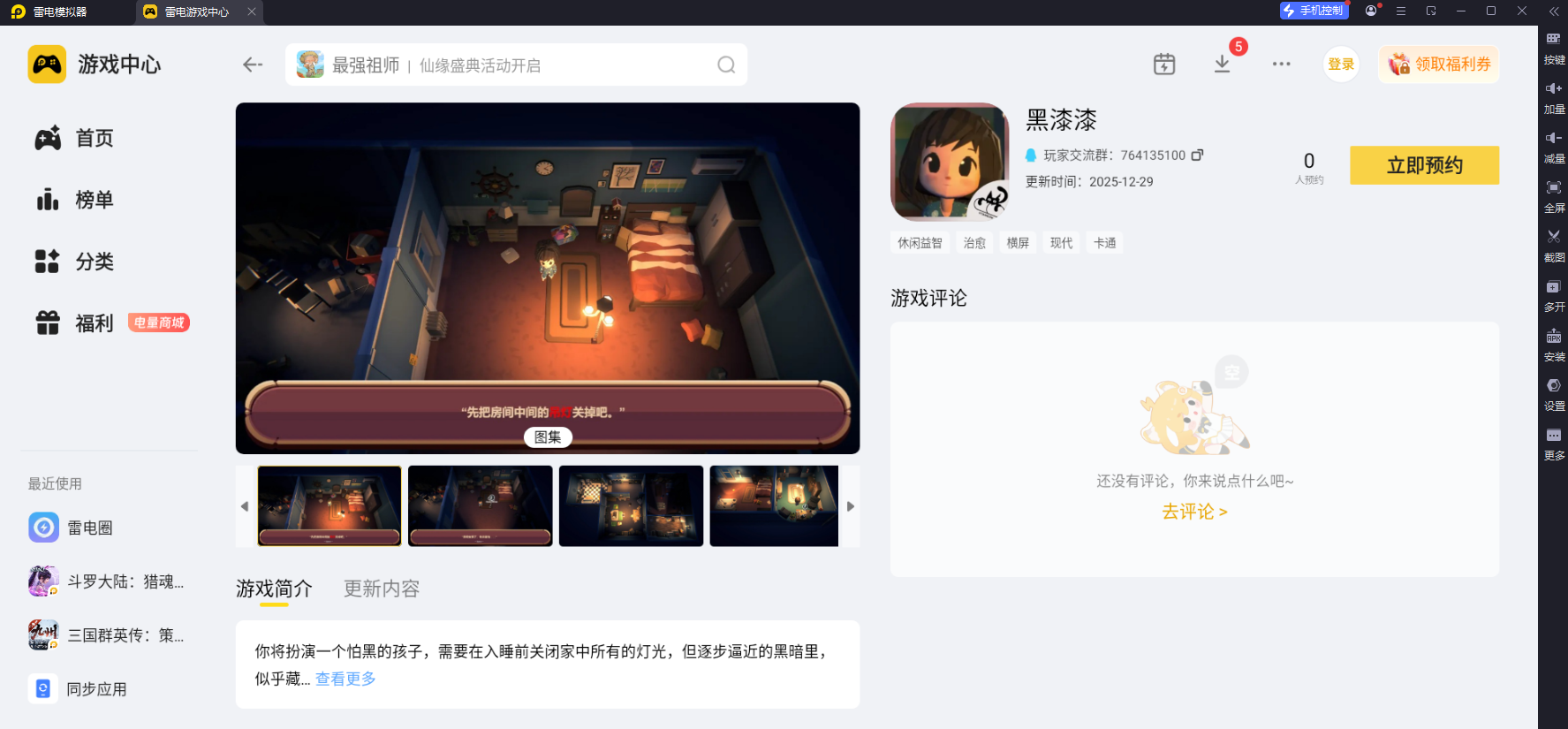 黑漆漆模拟器就给大家推荐到这里啦。不管是想看清场景细节找开关,还是想摆脱手机操作局限,雷电模拟器都能满足需求。赶紧载雷电模拟器里预约,和小女孩一起在温馨的灯光谜题中,解锁每一个房间的关灯挑战吧!