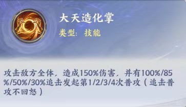 ▪️ 大天造化掌(核心技能):攻击敌方全体,造成150%伤害,100%/85%/50%/30%概率追击1-4次普攻(追击不回怒,群伤爆发关键)
