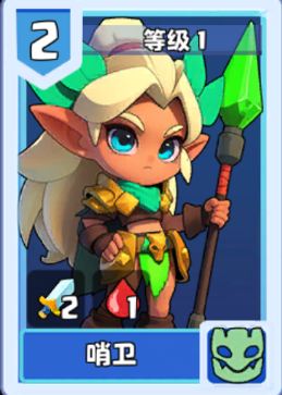 b.哨位:具有范围攻击能力,可有效应对敌方突进或优先攻击自身周围一格内位于身后的敌人,是优秀的功能卡。与女猎手一样是低品质蓝卡,养成成本低,容易拉满,后期也可以作为副卡使用。