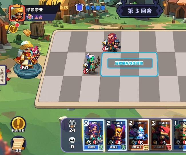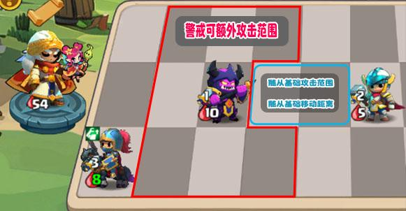 3.警戒随从:若自身攻击范围内有敌人,则不移动并攻击;否则向右移动2格。