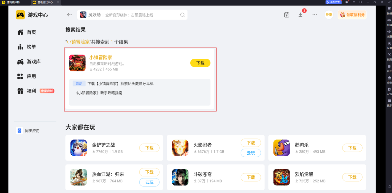 在众多适配《小镇冒险家》的模拟器中,雷电模拟器凭借稳定的运行表现和贴心的功能设计,成为多数玩家的心头好。它能精准适配游戏的各项机制,让玩家在电脑端也能享受原汁原味的冒险体验。下载方式也十分便捷,大家在官网下载好雷电模拟器,然后在雷电游戏中心搜索该游戏点击下载即可游玩。