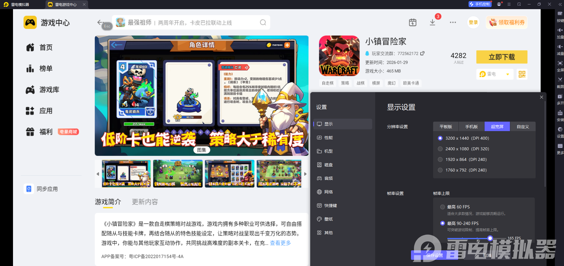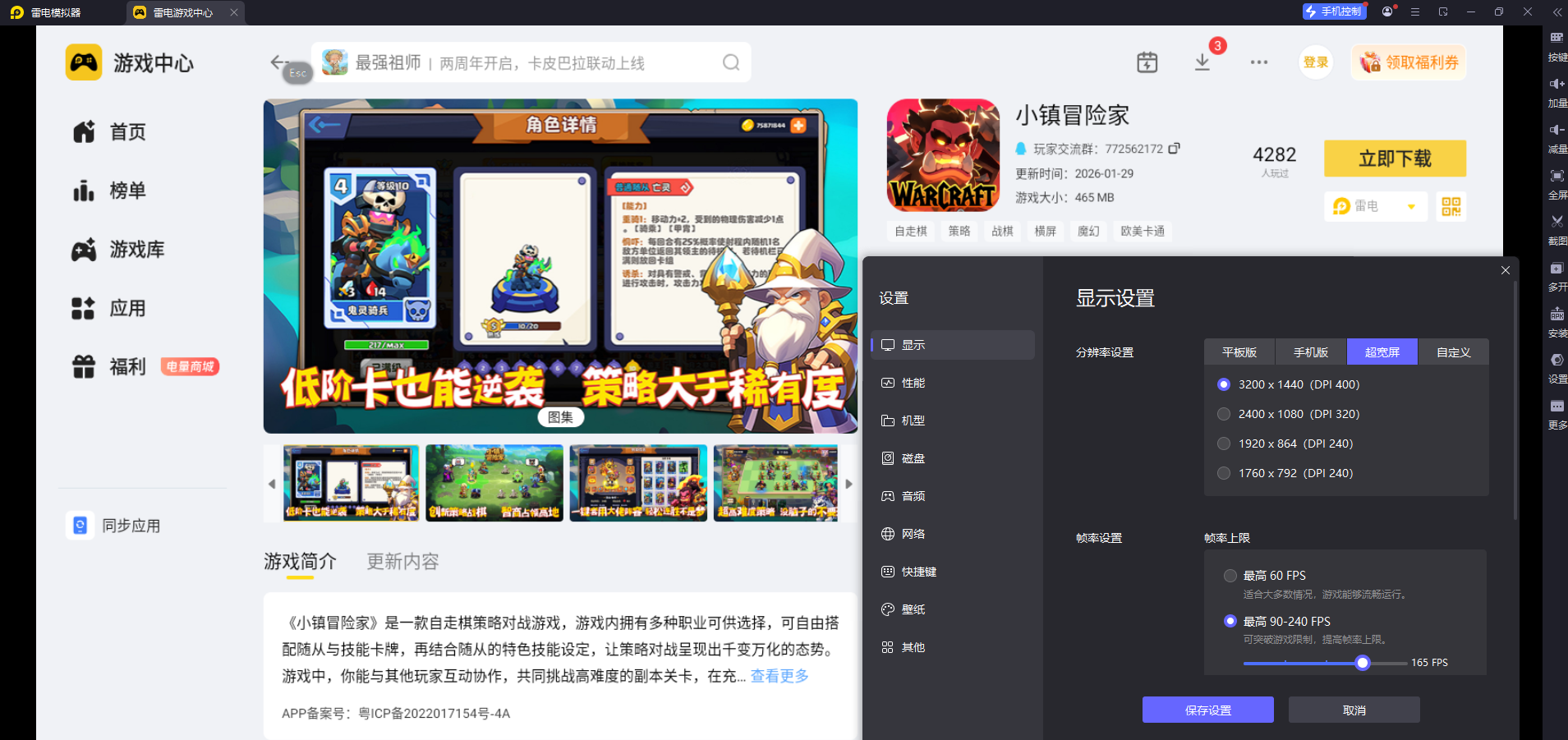 《小镇冒险家》采用清新卡通的美术风格,不管是充满生活气息的小镇场景,还是Q萌灵动的角色立绘,都有着丰富的细节刻画。雷电模拟器支持4K分辨率和165稳定帧率模式,能完美还原游戏的色彩与细节,石板路的青苔、角色的服饰纹理都清晰可辨。同时超宽屏显示设计能拓宽视野,在策略对战时,整个棋盘布局和随从位置一目了然,让玩家更直观地观察战局变化。