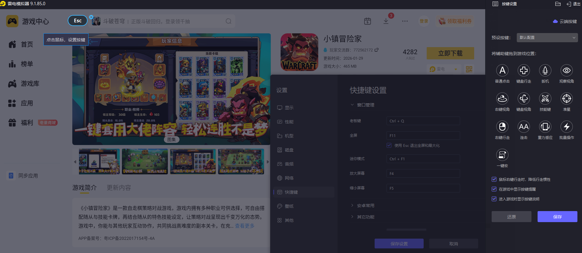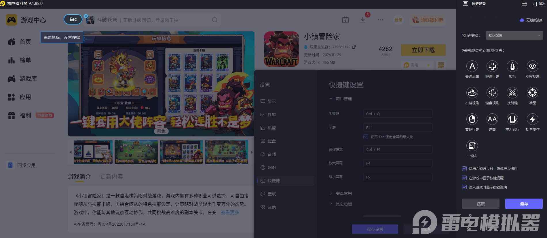 《小镇冒险家》作为自走棋类策略游戏,核心操作是排兵布阵和随从部署,需要精准的点击和快速的决策。雷电模拟器支持自定义按键映射,玩家可以根据自己的习惯设置部署、选择随从等操作的快捷键,用鼠标键盘操作比手机触屏更精准。尤其是在多随从同时部署的情况下,键鼠操作能减少误触,让每一步布局都准确到位,大大提升对战时的操作效率。
