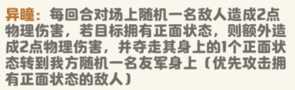 该技能是一个兼具输出与干扰敌方增益效果的强力技能,能稳定输出的同时,还能精准的打击敌方有增益的随从,在对战中,若敌方上了正面增益,我们便可以让恶魔猎手进行偷取,给我方的随从进行加强,且还能给予敌方主要随从4点伤害!!