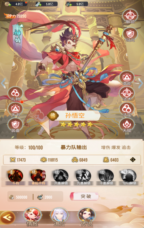 - 六星被动:T0,普攻后自身增伤10%,持续7回合且效果可叠加,是孙悟空持续爆发的核心,叠满后输出呈指数级增长。