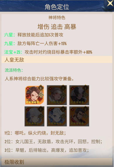- 哪吒(1位):纵火灼烧,为全队提供核心debuff,是体系启动器,负责给敌方挂上灼烧效果。