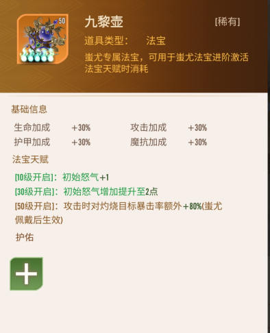 九黎壶是蚩尤的专属法宝,基础属性为生命、攻击、护甲、魔抗各+30%,能全面提升蚩尤的生存与输出能力。