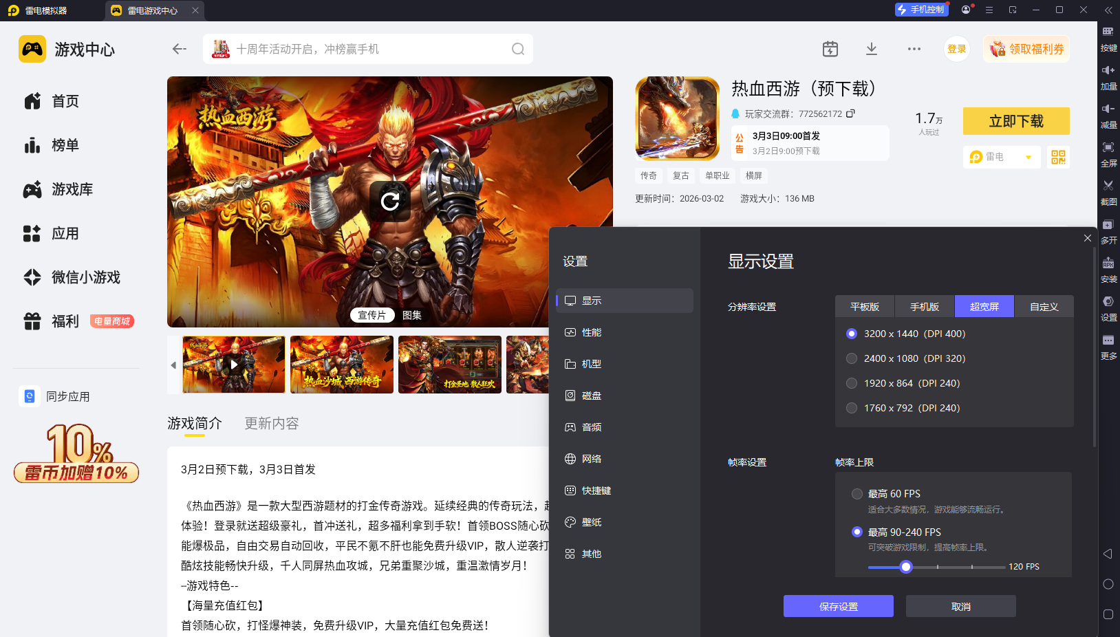 启动模拟器后,在搜索栏输入“热血西游”,找到对应手游并点击下载安装,安装完成后,可在模拟器设置中调整分辨率、分配内存,还能自定义键鼠映射,适配游戏操作,点击游戏图标立即游玩,无需额外配置,运行流畅不卡顿,支持多开和挂机,让你轻松享受沉浸式西游冒险。