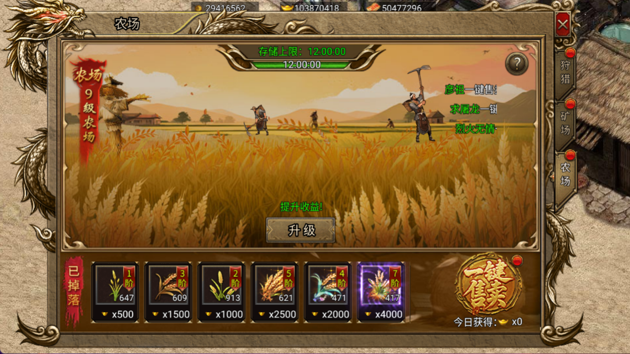 在《烈火一刀》中,【狩猎】【矿场】【农场】是散人玩家与零氪玩家最重要的稳定资源来源。三大玩法均为全自动产出机制,只需解锁后挂机即可持续获得大量基础资源,用于角色成长与战力提升。