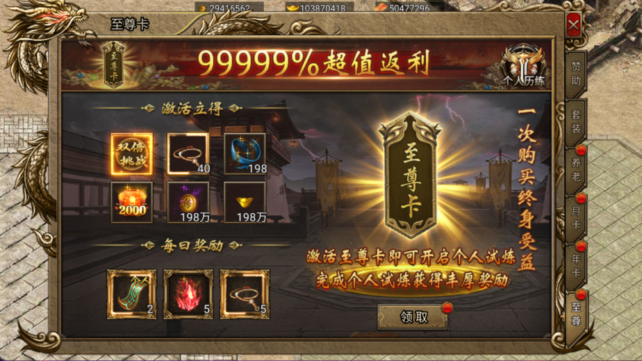 【至尊卡】属于高阶特权体系,激活后可开启专属个人试炼玩法,通过挑战获取稀有材料与大量奖励,适合中后期追求极限战力的玩家。整体来看,卡类系统与赞助系统可根据个人投入节奏灵活选择,合理搭配可在不重复投入的情况下,实现战力与资源的最大化提升。