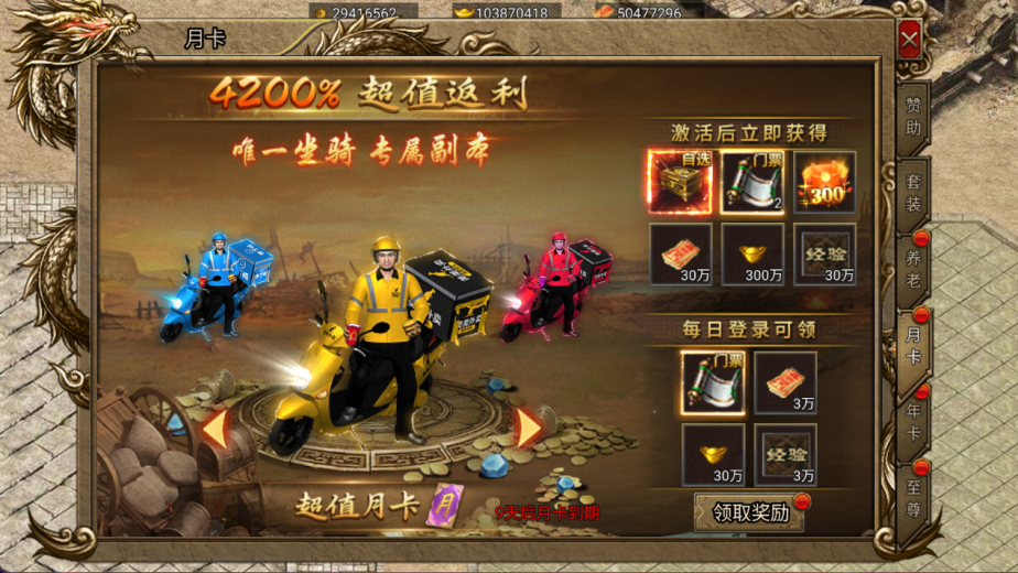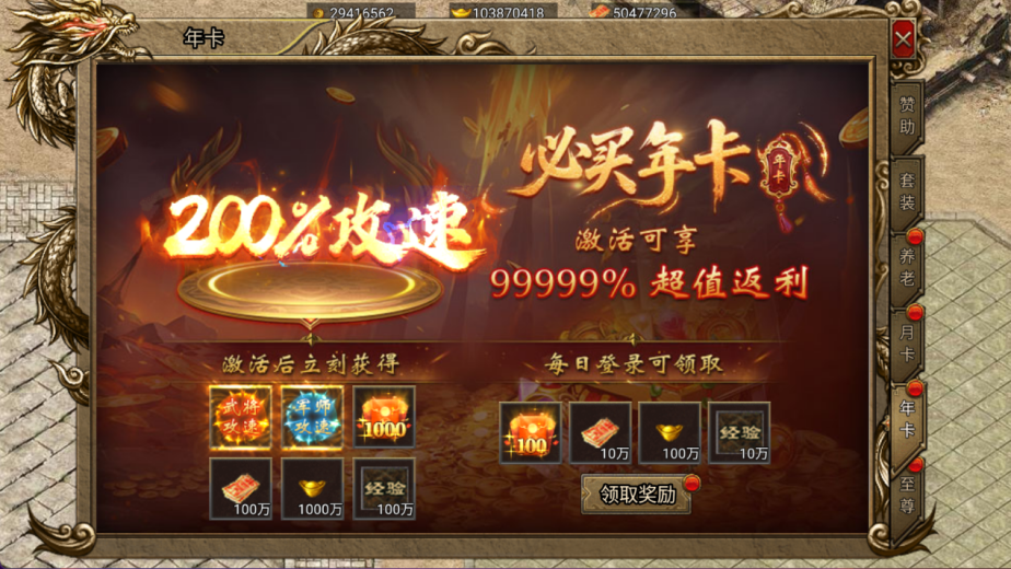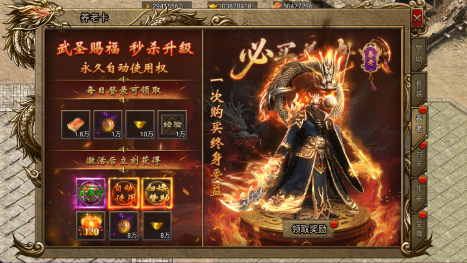 【养老卡】与【月卡、年卡】则偏向长期稳定收益,激活后每日可领取灵符、元宝、经验等资源,并解锁自动使用等实用功能,适合散人或轻度付费玩家持续成长。其中月卡侧重短期性价比,年卡则提供长期攻速与超高返利,对挂机效率提升明显。