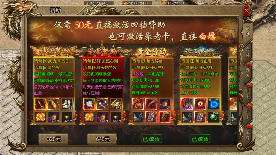 在《烈火一刀》中,【赞助系统】与各类【卡类特权】构成了玩家中后期成长的核心加速体系。通过激活不同档位赞助,角色可直接获得大量切割伤害、对怪减伤、吸血等关键属性,并伴随官职直升与转生跳级效果,大幅缩短养成周期。 赞助档位之间属性可叠加生效,适合希望快速进入高阶地图与BOSS玩法的玩家选择。