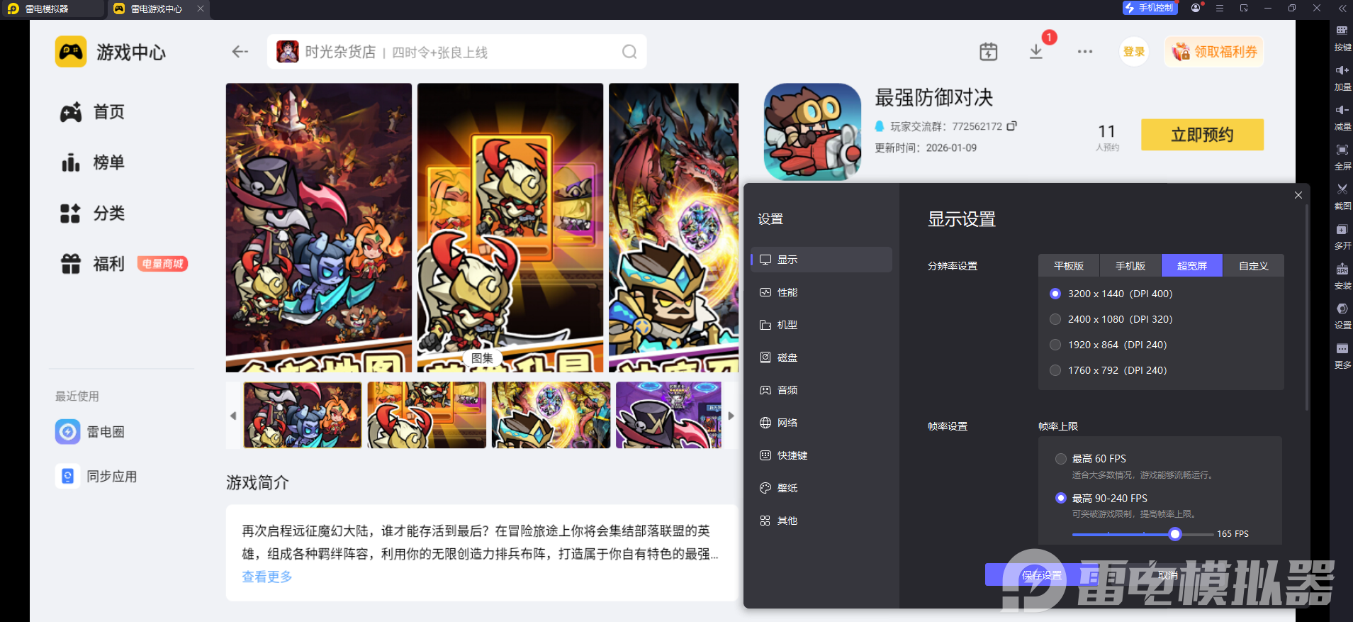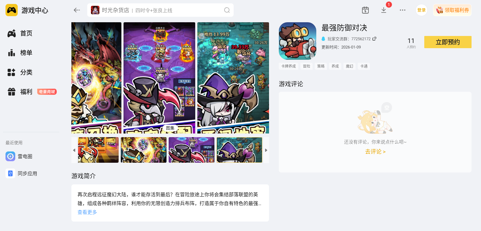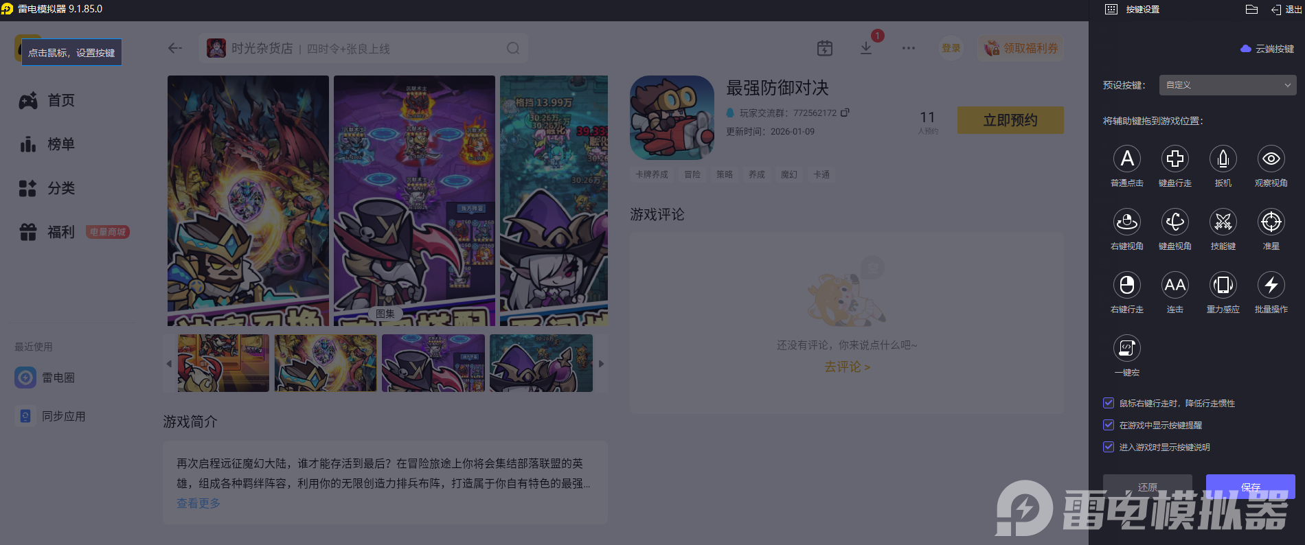 最强防御对决电脑版就给大家推荐到这里啦。大家可以通过官网下载雷电模拟器,然后在雷电游戏中心中搜索“最强防御对决”,点击预约即可,渠道正规安全,安装简单快捷。大家赶紧行动起来吧!