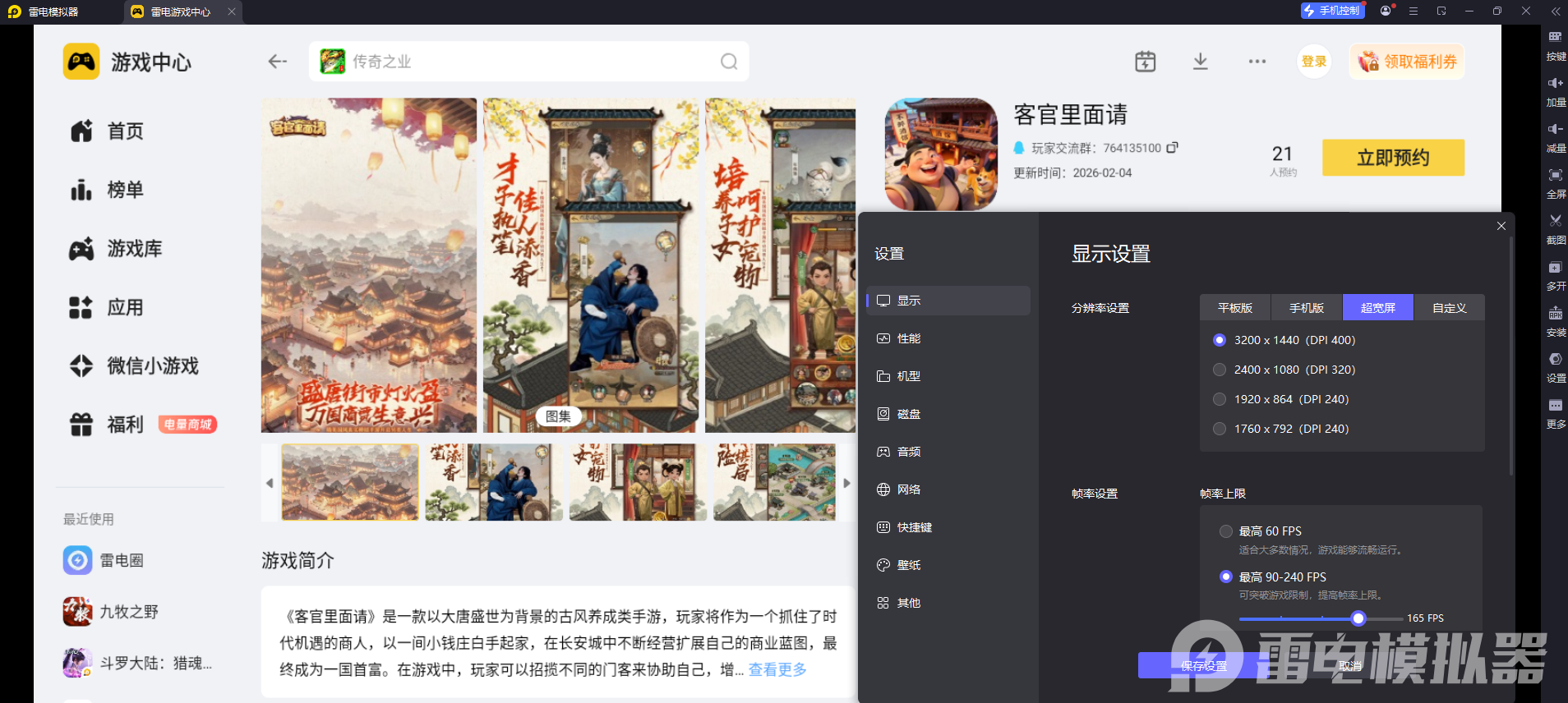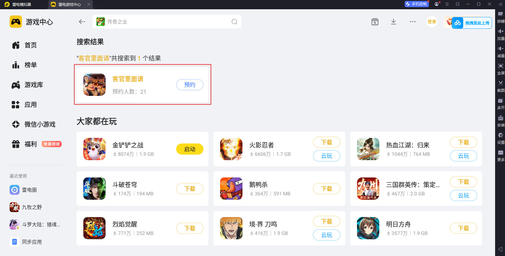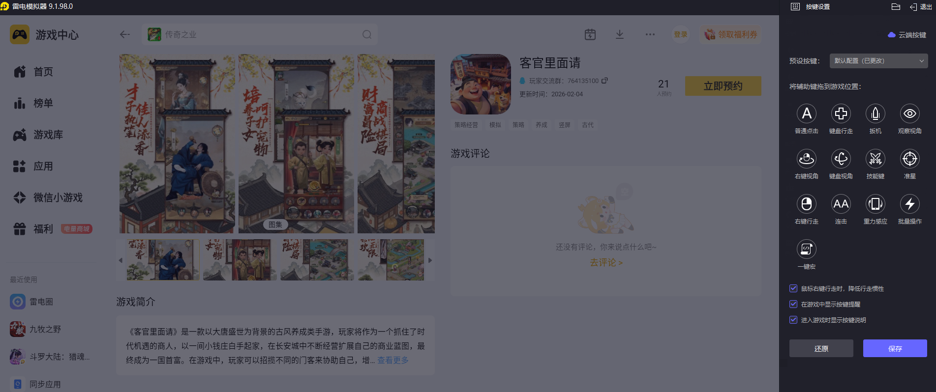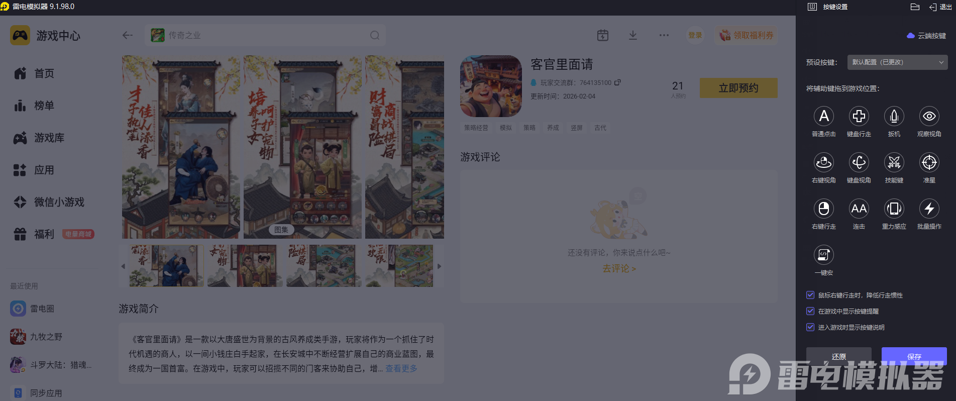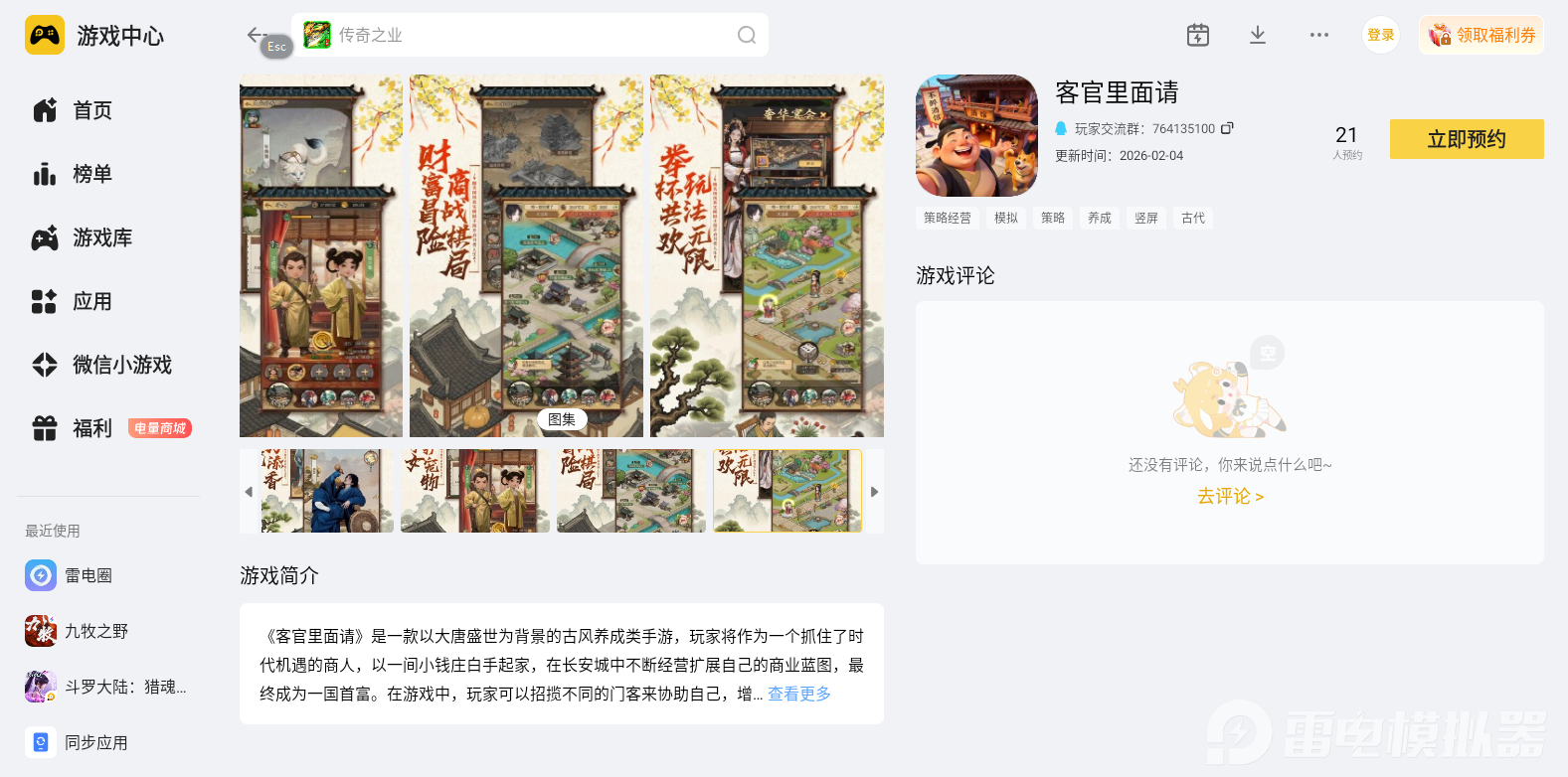 想要畅玩《客官里面请》,选对模拟器能让整体体验翻倍,这里真心推荐大家用雷电模拟器。大家直接打开电脑浏览器,进入雷电模拟器的官网下载,安装完成后,在雷电游戏中心搜索《客官里面请》,就能直接预约游戏,提前预约还能不错过上线后的专属福利。