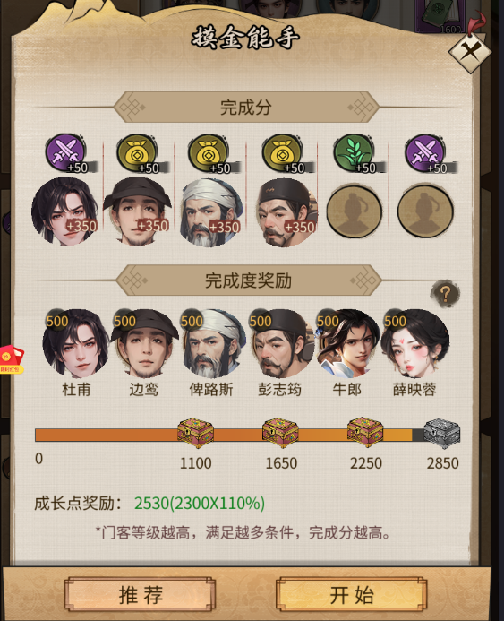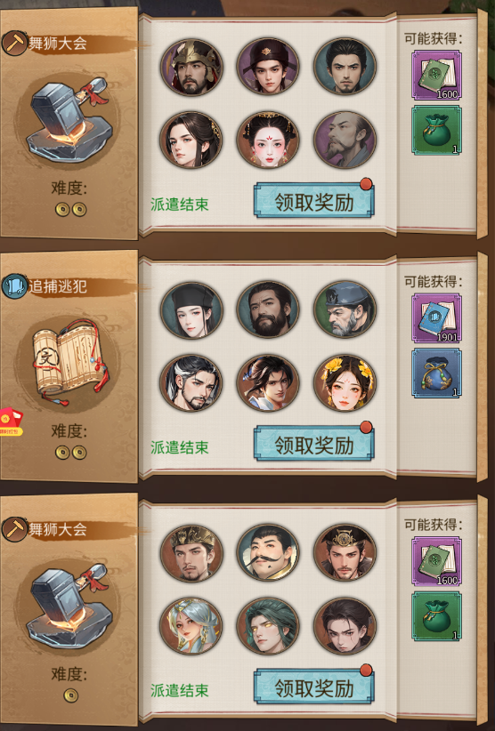 驿站中有多个不同任务,如盗亦有道、街头卖艺、捕鱼高手等,每个任务耗时约 1 小时,派遣前要先查看任务要求,指定门客派遣能获得更多奖励,且奖励数量与门客能力值挂钩,门客等级和资质越高,完成分越高,奖励越丰厚。