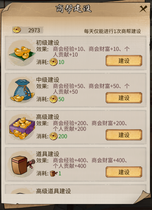 加入商帮后,首先要完成每日商帮建设,这是提升商帮等级和获取个人贡献的关键,商帮建设分为金币建设和道具建设,共六种级别,从初级建设(10 金币)到超级道具建设(建设铁锤),投入越多,获得的商帮经验、商帮财富和个人贡献越多。