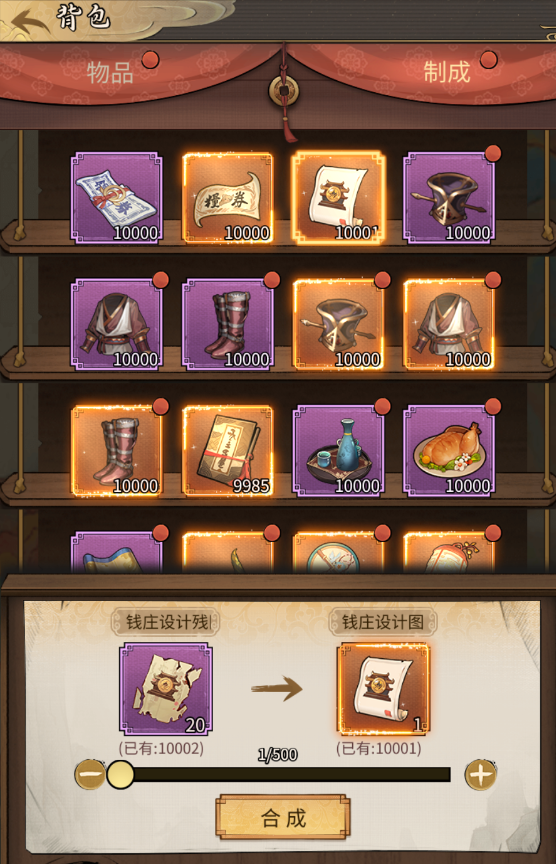 这里分享几个道具制作的优先级:首先制作门客突破道具,尤其是稀有和传说系列,能快速提升核心门客等级上限;其次制作高级飞钱,使用后能立即获得营收 1 小时后的收益,营收越高,收益越丰厚;最后制作高级食材、高级茶水等宴会道具,用于举办宴会获取更多宴会币。另外,背包中的道具碎片要及时整合,避免堆积,若某类道具材料不足,可通过闯荡、集市购买等方式补充,确保道具制作的连续性。