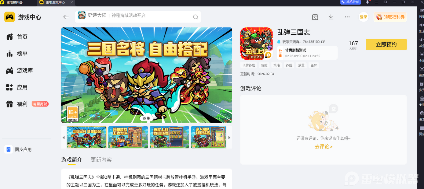 乱弹三国志之中的即时国战、挂机养成人物玩法想要发挥到极致,模拟器的适配性是尤为重要的。由于该游戏设置了q版画质,以及炫酷的技能特效展示,因此要避免画面压缩影响游戏体验。其次,还要与游戏的实时操配需求,在攻城掠地、与其他武将作战之时的操作衔接流畅。而雷电模拟器与这些需求相当贴合。