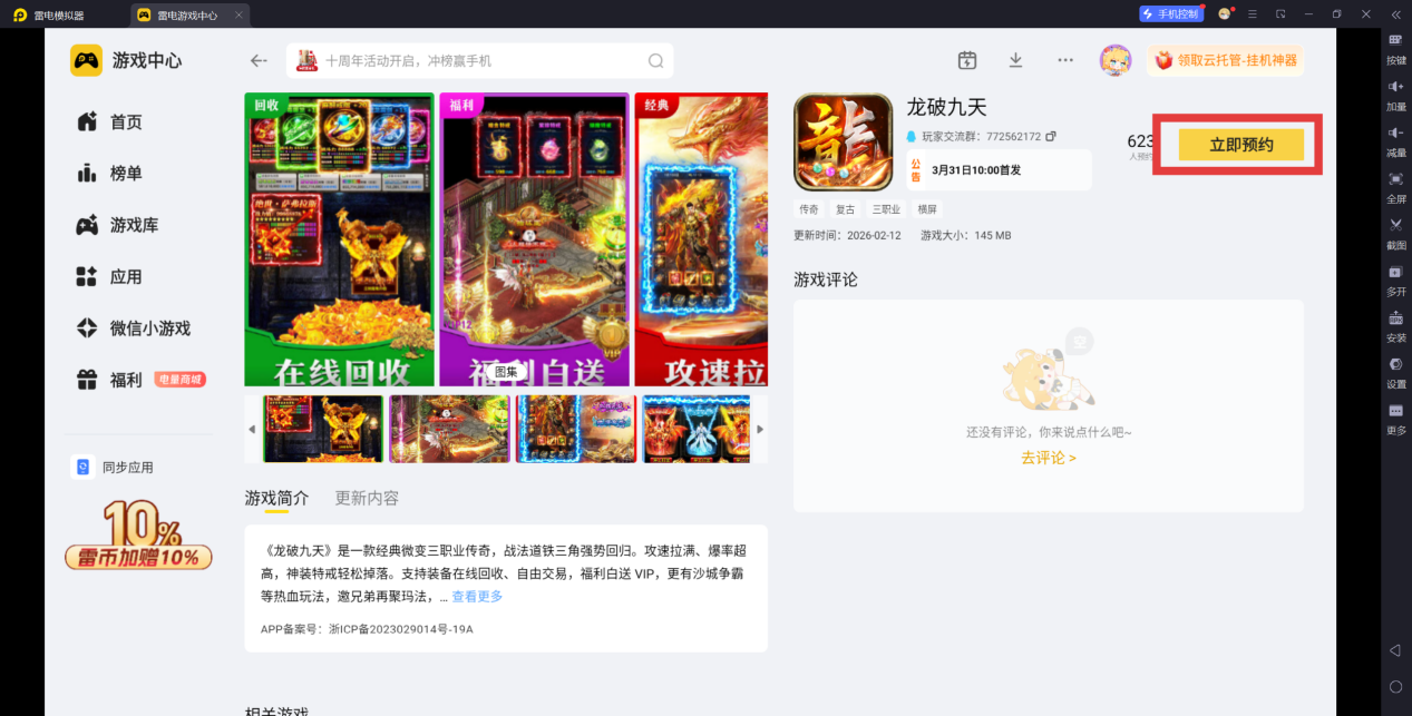关于龙破九天模拟器下载的内容就介绍到这啦,推荐通过雷电模拟器预约龙破九天,不仅能享受高清大屏的视觉盛宴,还能体验键鼠操作的精准畅快,叫上兄弟一起重返玛法,再战沙城吧!