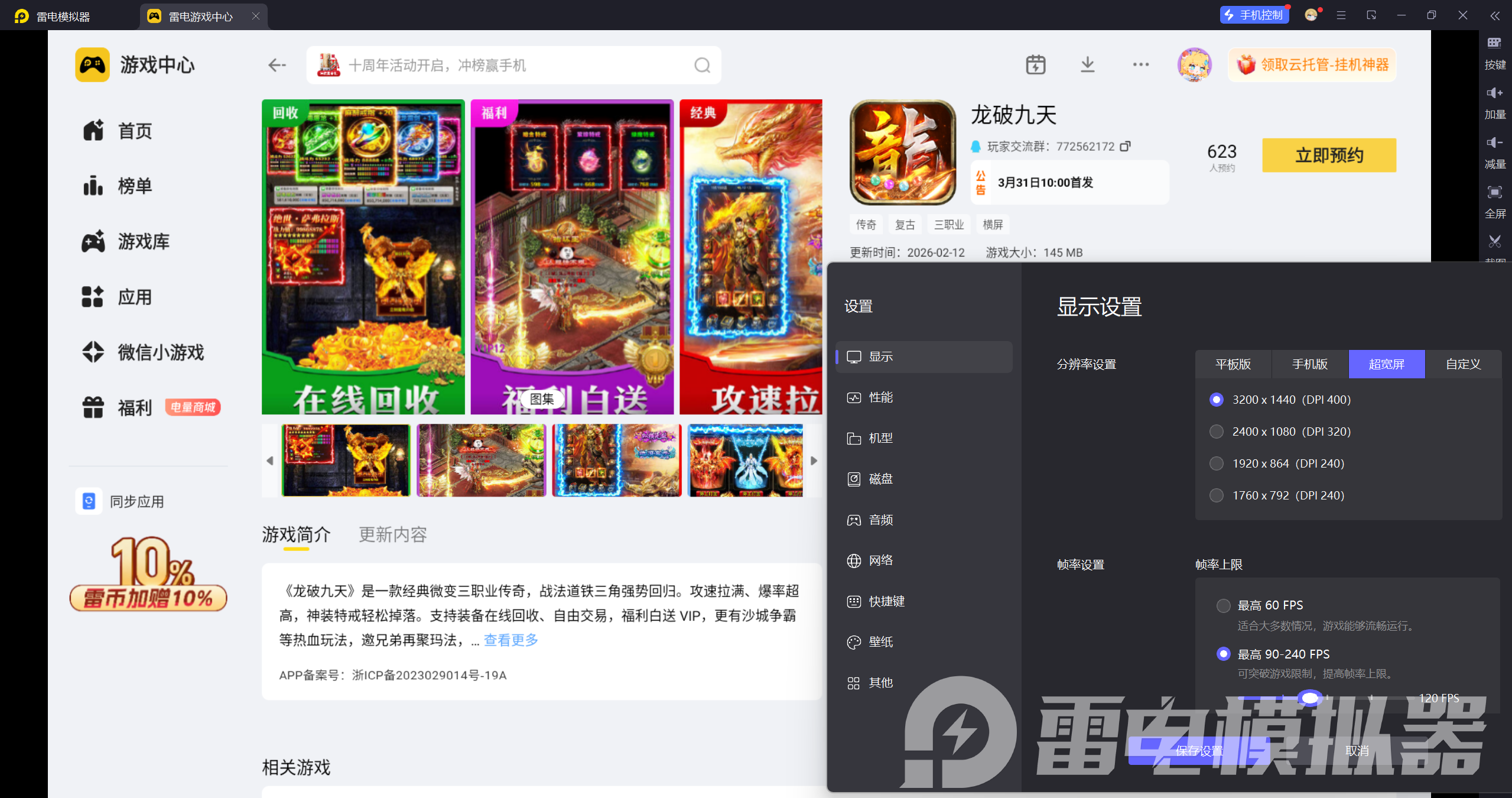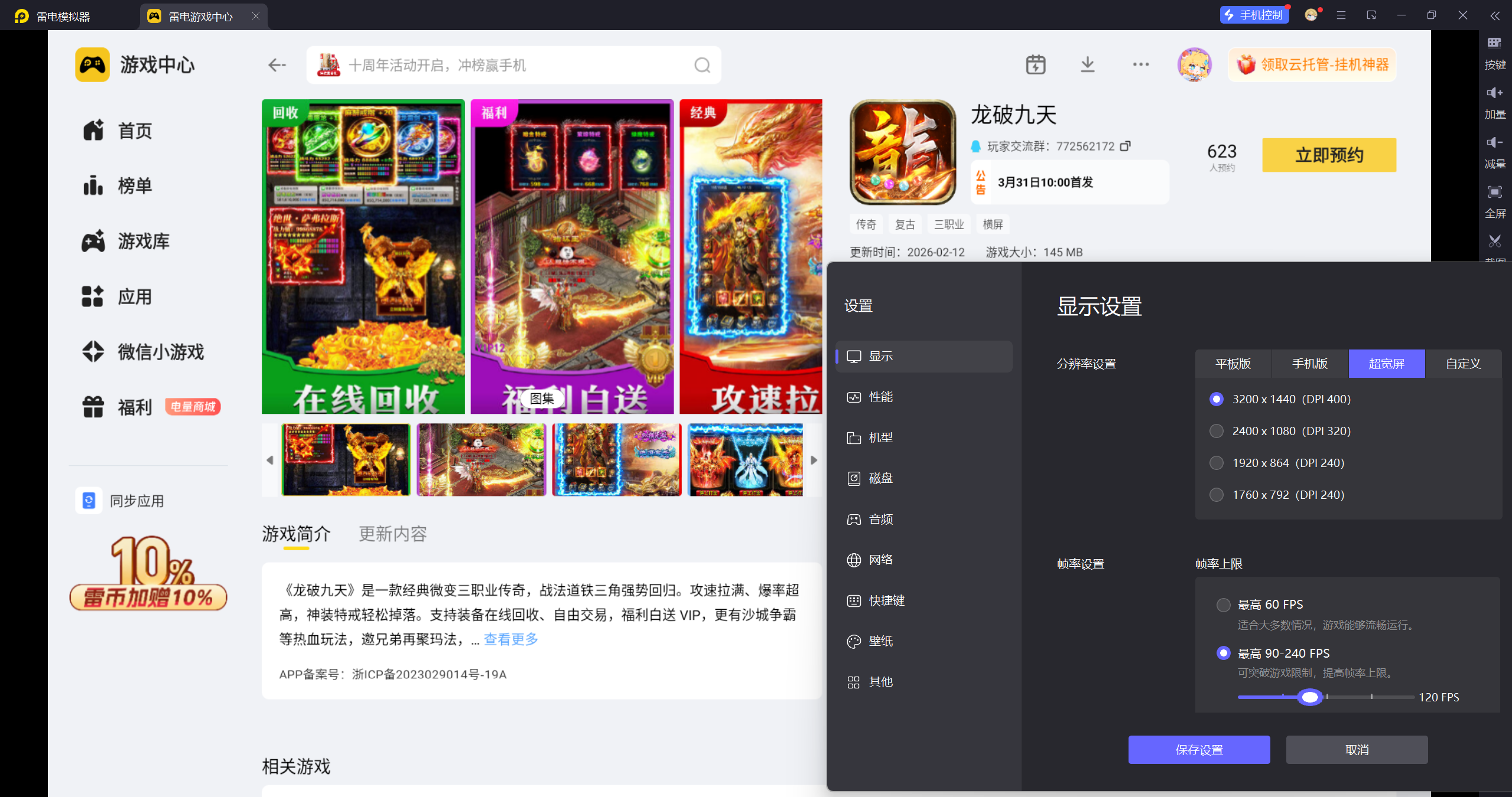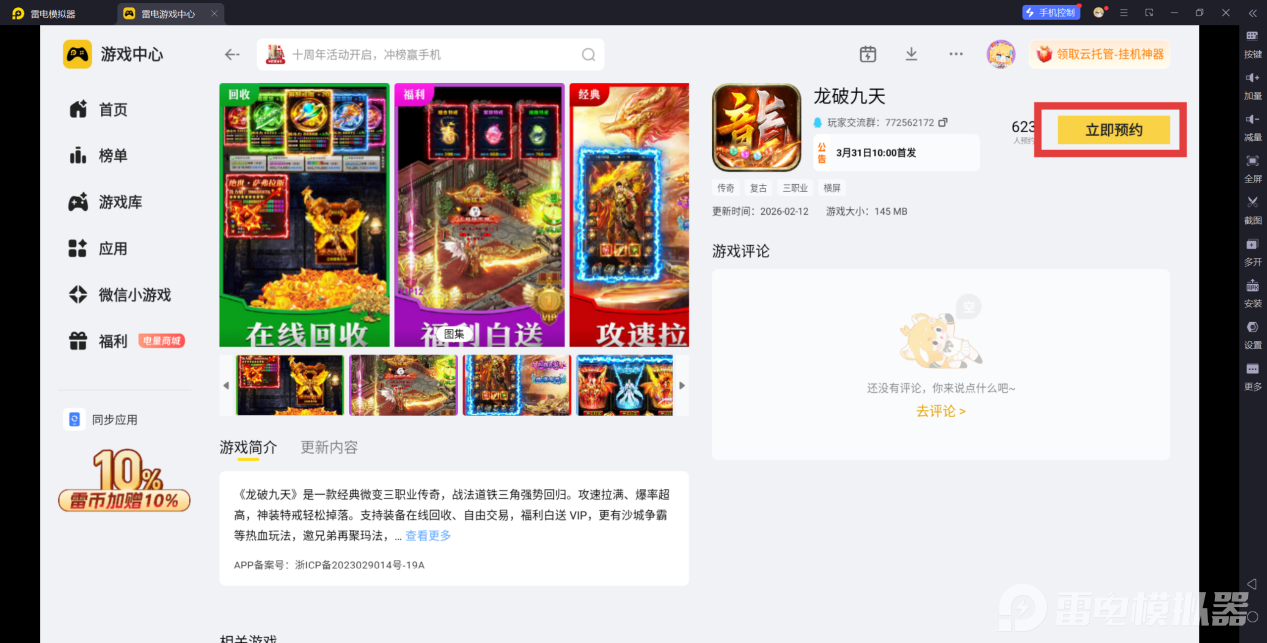 启动模拟器后,在雷电游戏中心搜索龙破九天,预约游戏,等待游戏上线后,点击下载按钮即可自动安装。安装完成后,在模拟器应用列表找到游戏图标,双击即可启动,开启你的传奇之旅。