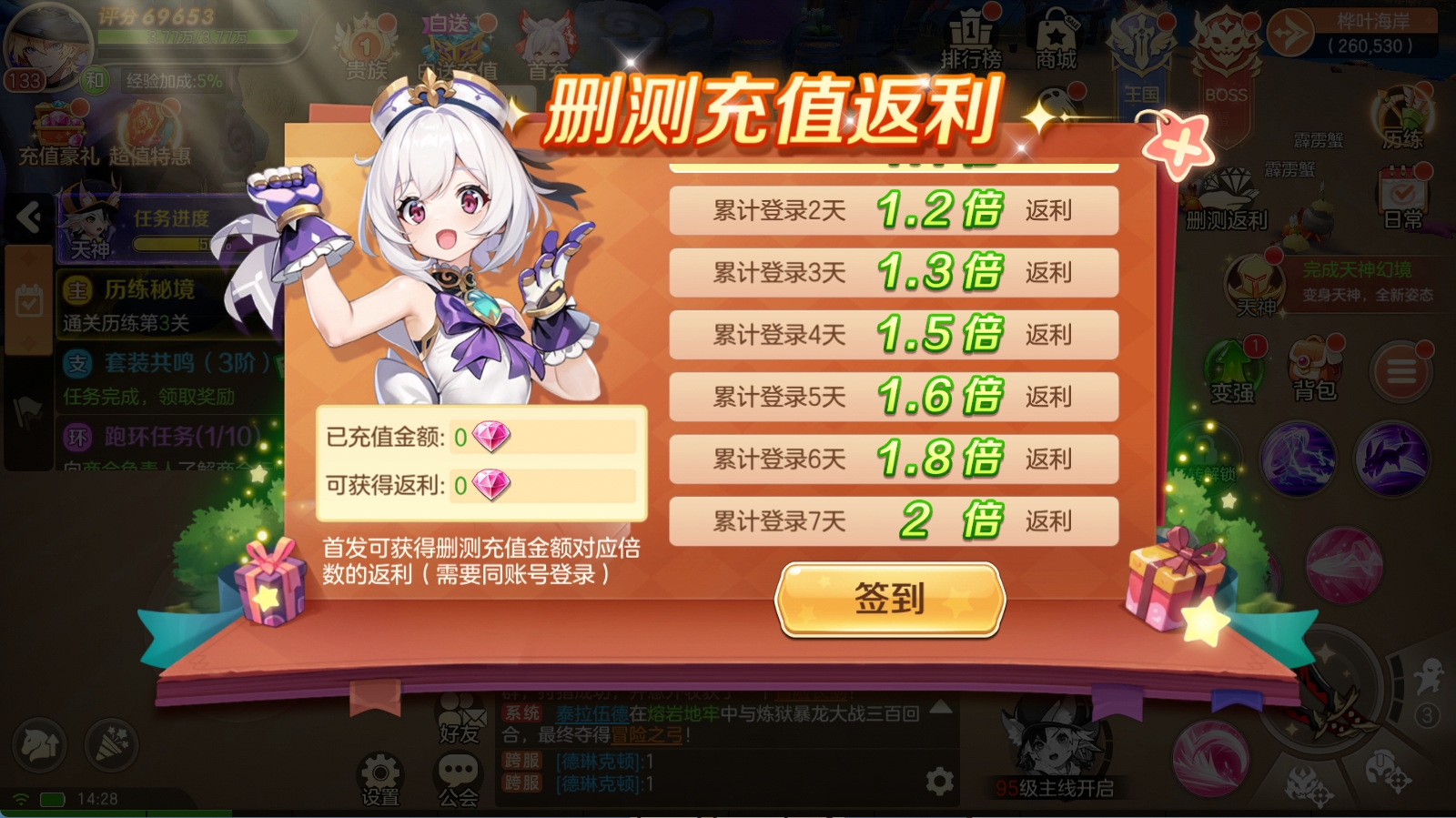 累计登录天数2天,在公测时可返还删测充值额度*10的1.2倍彩钻