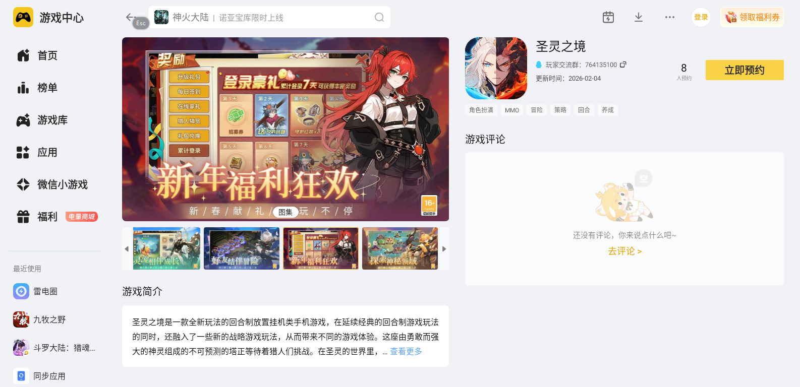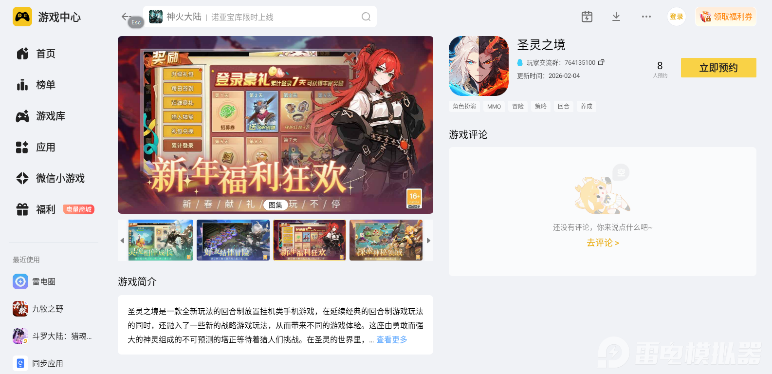 在这里,小编建议大家用雷电模拟器来玩《圣灵之境》,直接去雷电模拟器官网下载雷电模拟器,安装好后就能在雷电游戏中心里面预约《圣灵之境》,操作简单又安全。这款游戏是轻量化回合制MMO,有丰富的奇幻场景和多样的战斗玩法,用正规渠道的电脑版才能稳稳体验全部内容,雷电模拟器就是适配这款游戏的靠谱选择。