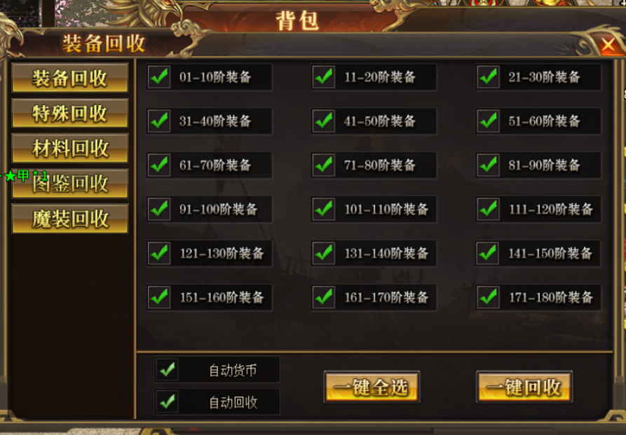 新人礼包领取自动回收以后在背包内勾选自动回收、自动货币,打到装备即可自动回收。