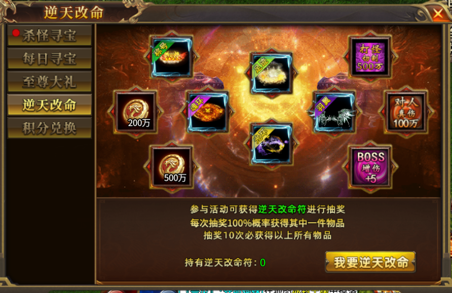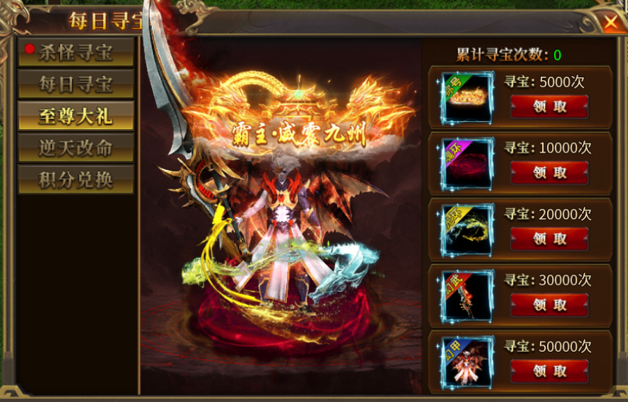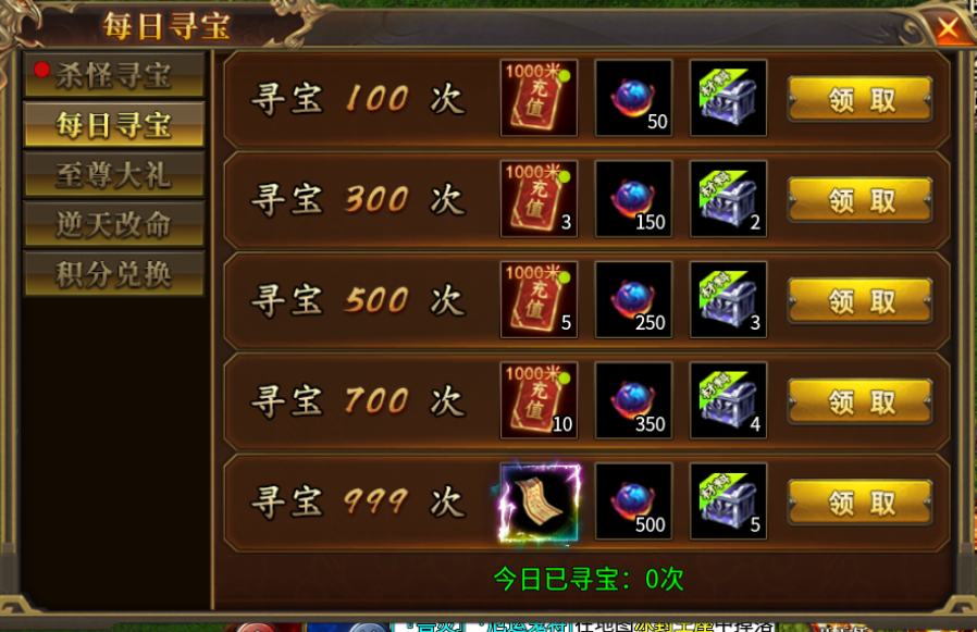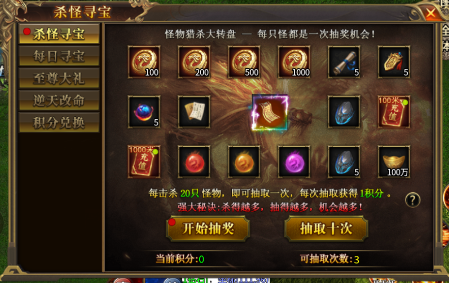 每天击杀20只怪物即可获得一次寻宝次数,杀的越多抽得越多上不封顶。