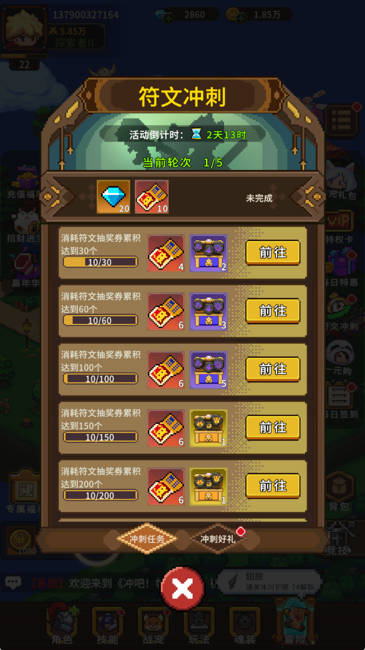 活动期间,消耗「璀璨符文抽奖券」,即可获得一定数量的符文抽奖券返还,另外再送各品质随机符文箱!符文冲刺将与宠物冲刺、秘宝冲刺活动循环轮换,各位囤囤鼠们可以合理安排资源~