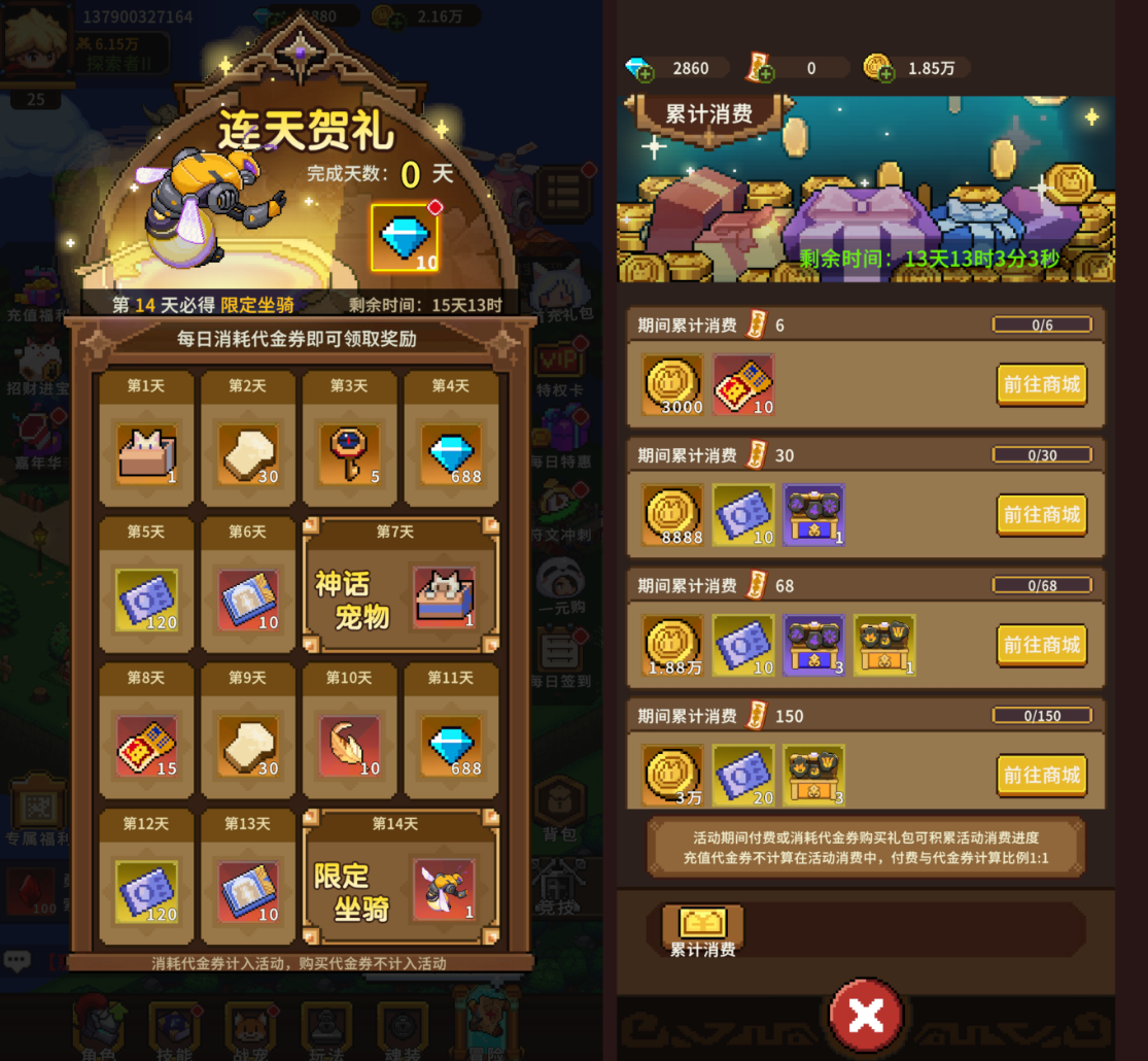 每日消费任意金额的代金券,都能在「连天贺礼」中领取奖励,连续消费14天还可获得限定坐骑「大黄蜂」。活动期间累计消费更有惊喜好礼等着大家~