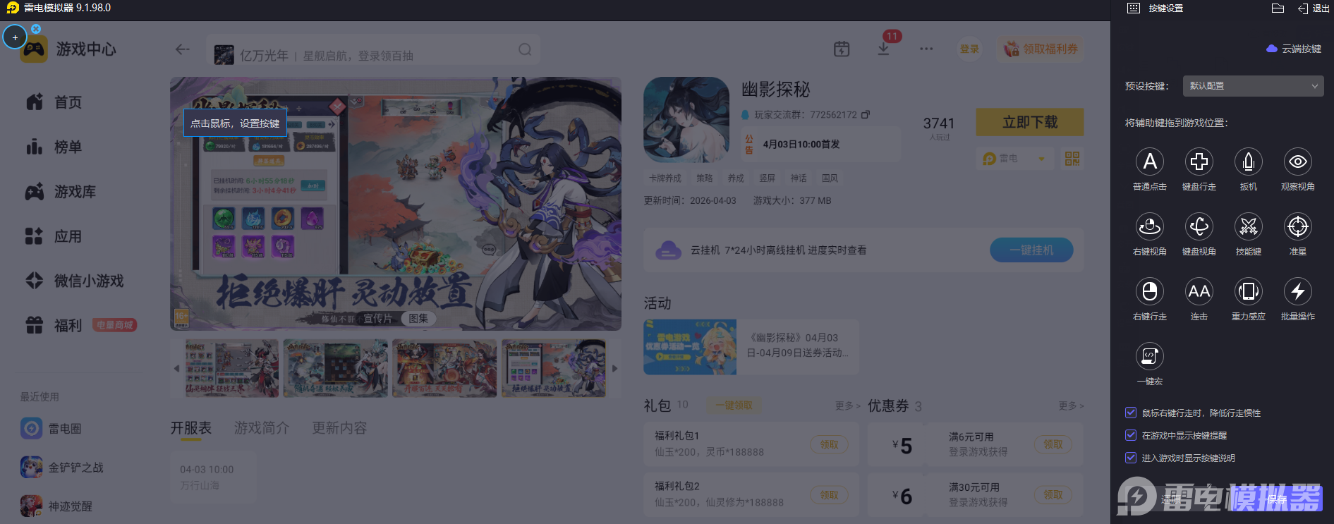 游戏闯关时需要频繁进行阵容切换、技能释放、秘境互动等操作,繁杂的操作流程需要更精准的操控方式,才能维持稳定的游戏节奏。雷电模拟器能优化操控逻辑,可以自定义按键设置,让各项操作触发更精准,大幅提升操作连贯性,完美适配游戏的高频操作需求。