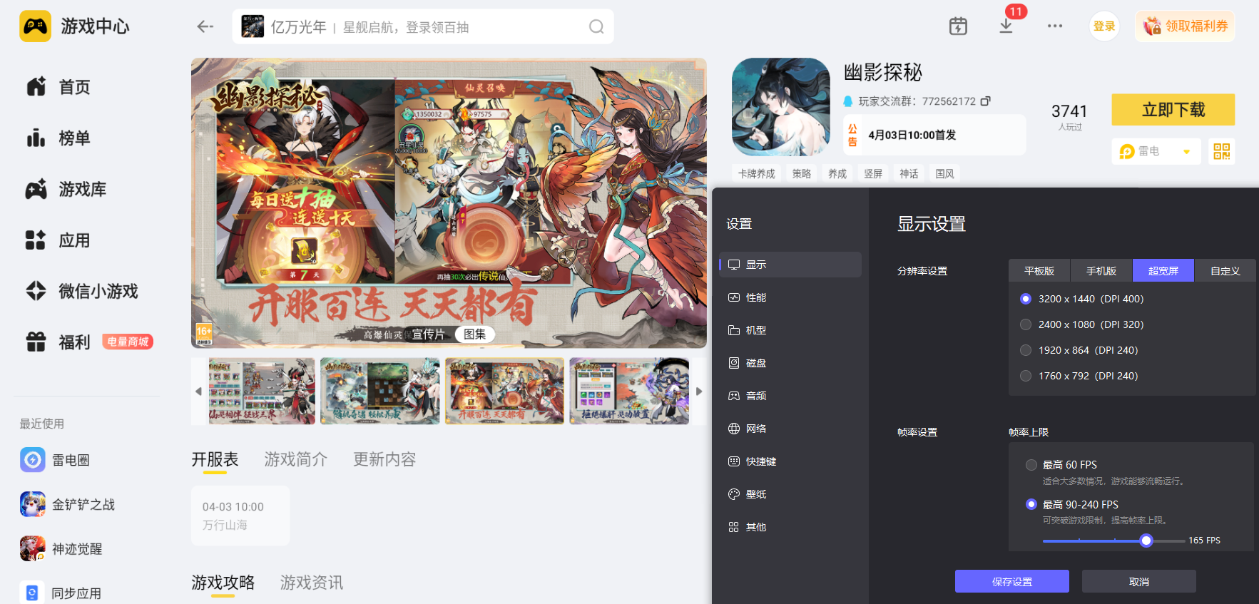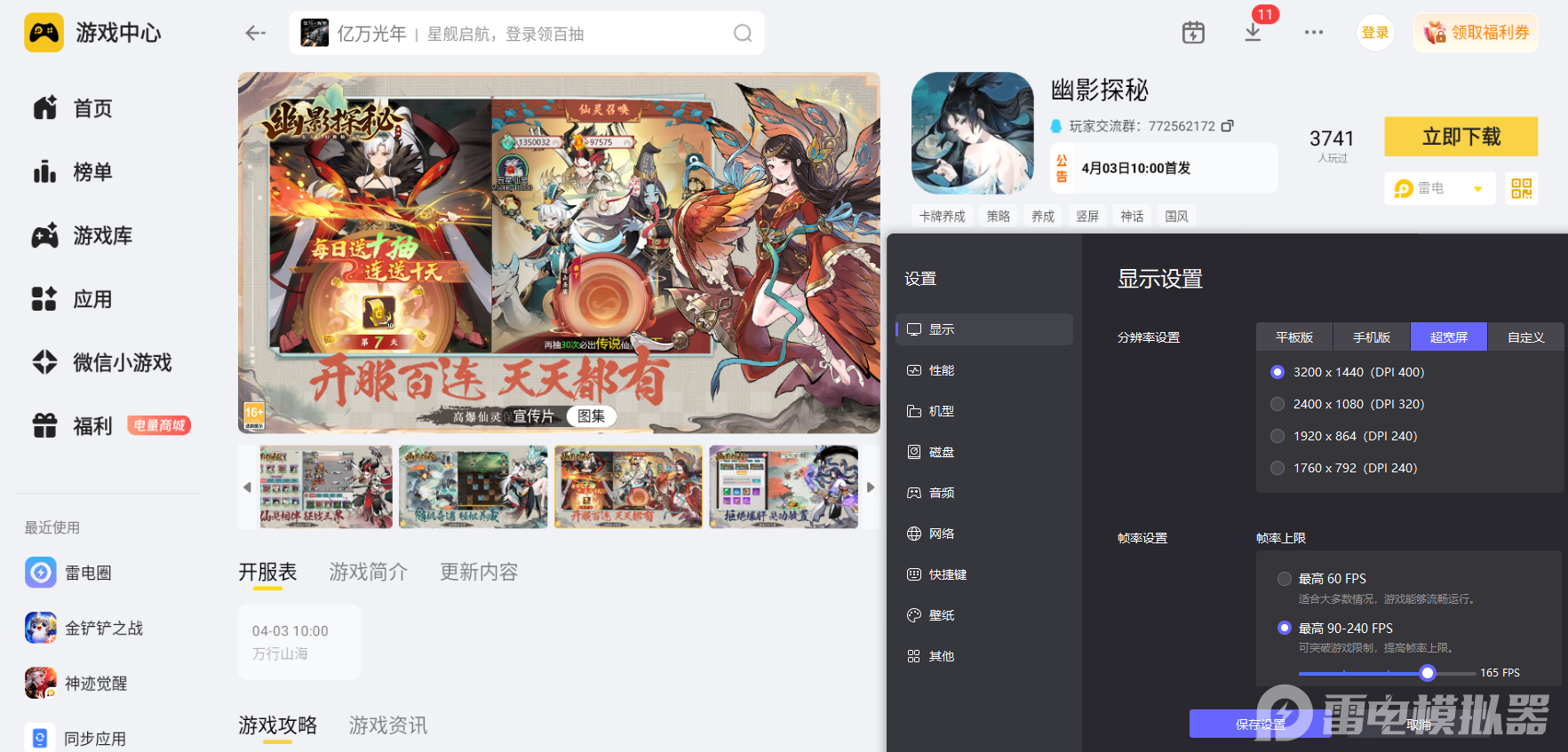 幽影探秘有着细腻的水墨国风秘境场景、精致的异兽立绘与丰富的场景线索,探索过程中需要清晰辨识各类细节,才能顺利推进秘境闯关进程。雷电模拟器支持4K分辨率+高清大屏显示,能完整还原场景纹理与角色细节,让秘境线索、技能特效都清晰可见。