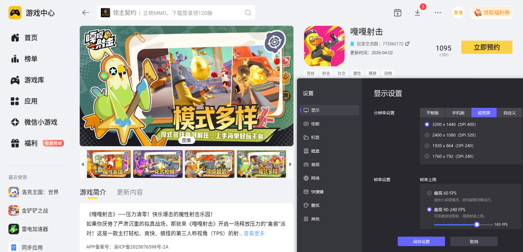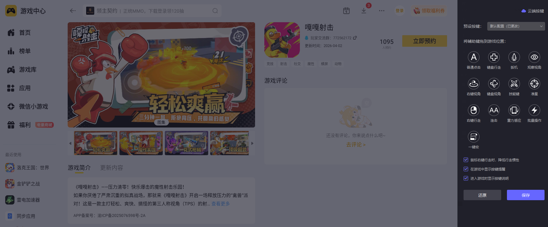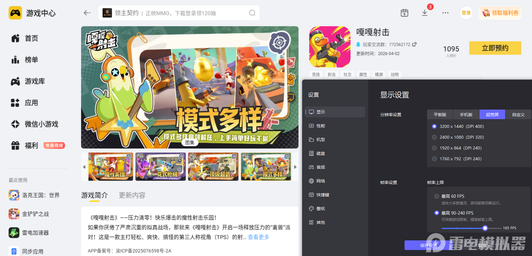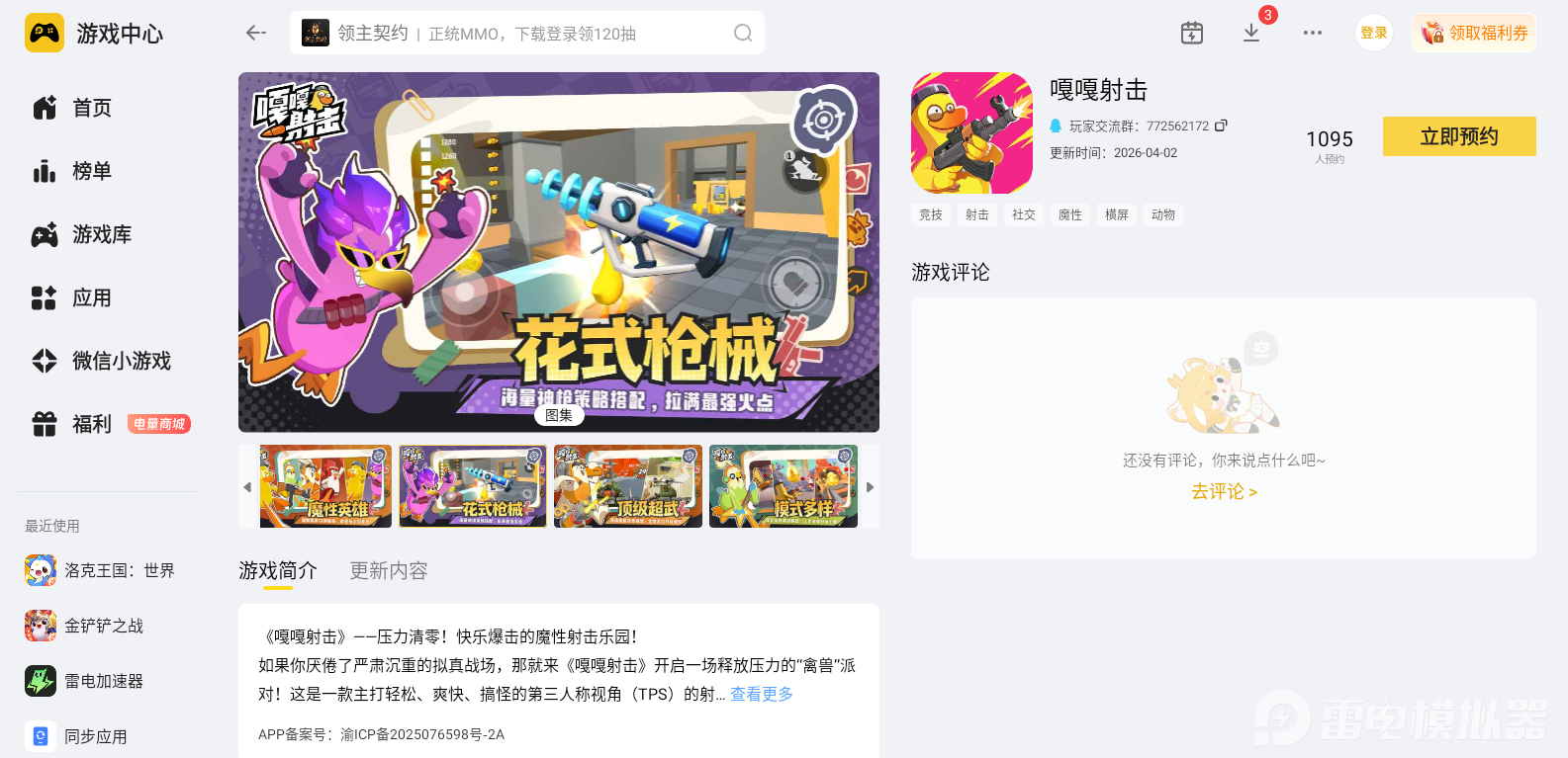 在电脑上游玩嘎嘎射击,可通过雷电模拟器来游玩。大家打开雷电模拟器官方网站,找到下载按钮完成程序安装,启动模拟器后,在内置的雷电游戏中心搜索框中查找嘎嘎射击并完成预约,游戏上线后即可在电脑上开启游戏,非常方便。