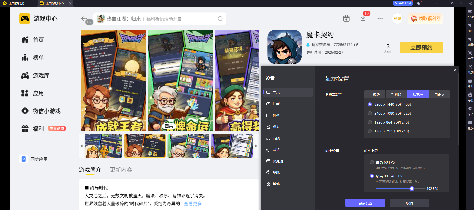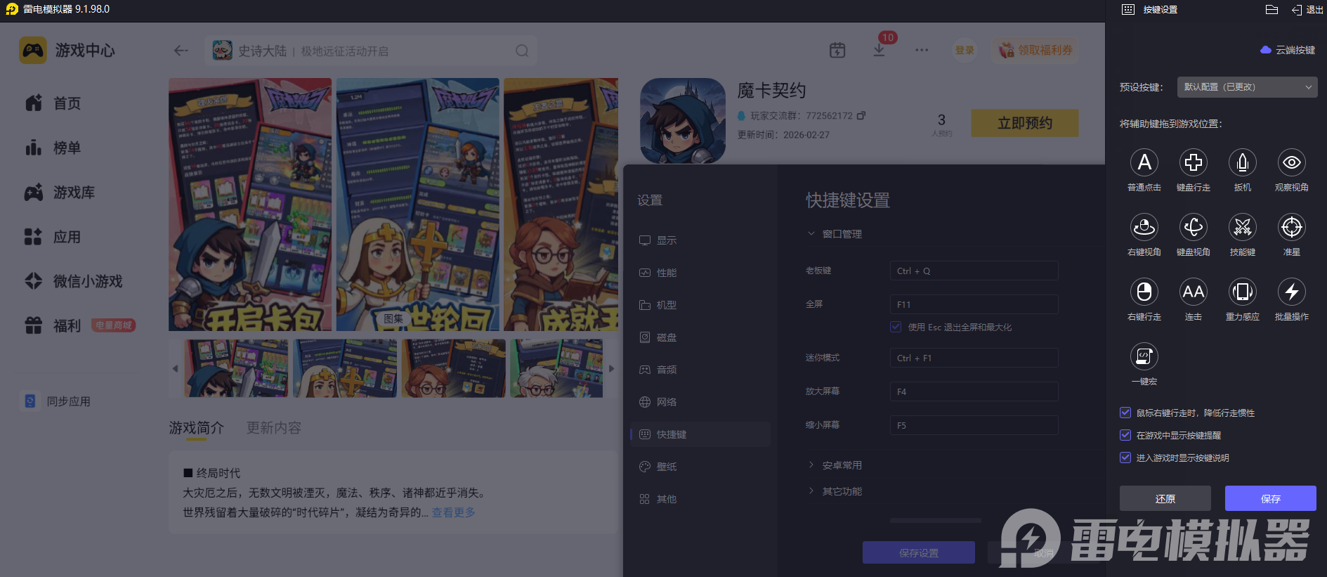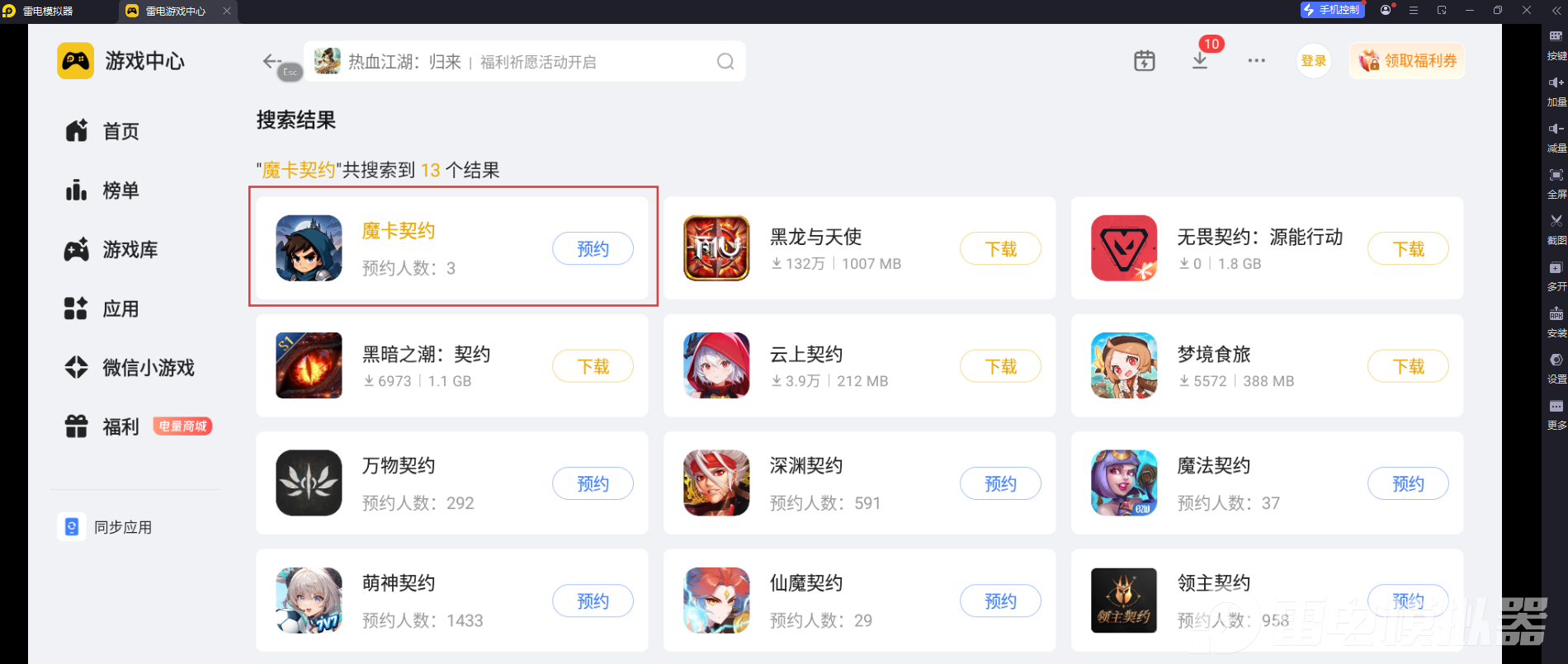 《魔卡契约》以卡牌收集、卡组构建和即时对战为核心玩法,对局操作多、对精准度要求高,同时游戏还有细腻的卡牌立绘、炫酷的技能特效,画面细节十分丰富。结合这款游戏的操作和画面需求,小编建议大家使用雷电模拟器来游玩,非常适合这款游戏。大家可以选择在官网下载雷电模拟器,然后在雷电游戏中心搜索“魔卡契约”,然后点击预约即可。