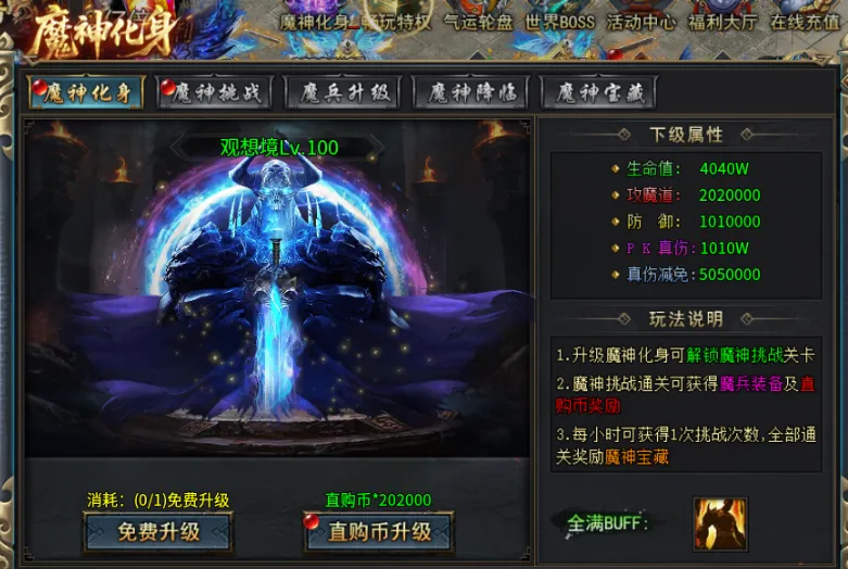 可通过升级魔神化身提升基础属性和PK属性 ,还可以挑战魔神获取整套魔兵,提升魔神降临还可获得魔神技能。