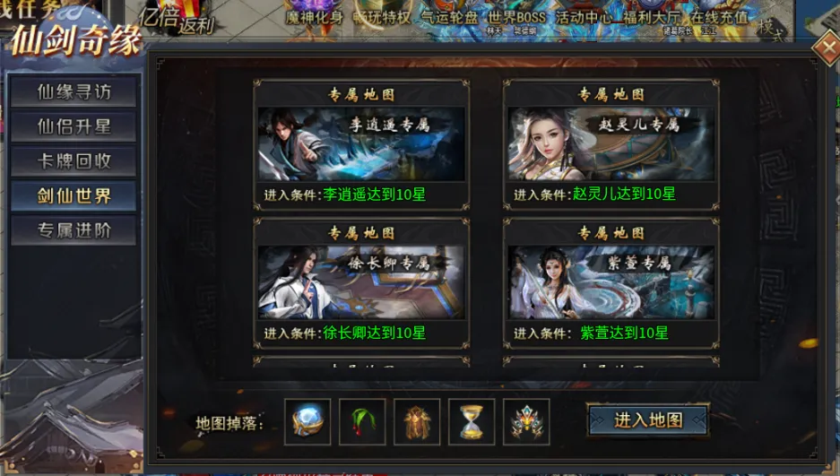 仙缘寻访,获取仙侣图鉴,仙侣图鉴达到十星可解锁专属地图,指定仙侣达到十星,还可以解锁专属羁绊获得稀有PK属性。