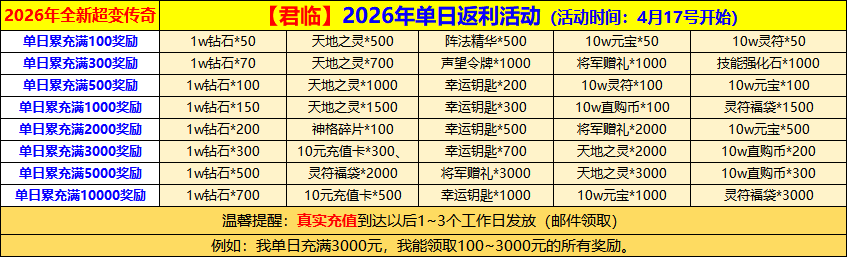 活动规则:1、活动时间:2026年4月17日开始,按单个自然日计算(00:00~23:59);2、单日累充档位可叠加领取;3、单日累计充值达到条件后(仅计算真实充值),次日可联系专属客服申请(游戏内左侧悬浮球-专属客服扫码添加);4、达标后需及时申请,7天内达标都可申请,逾期作废。