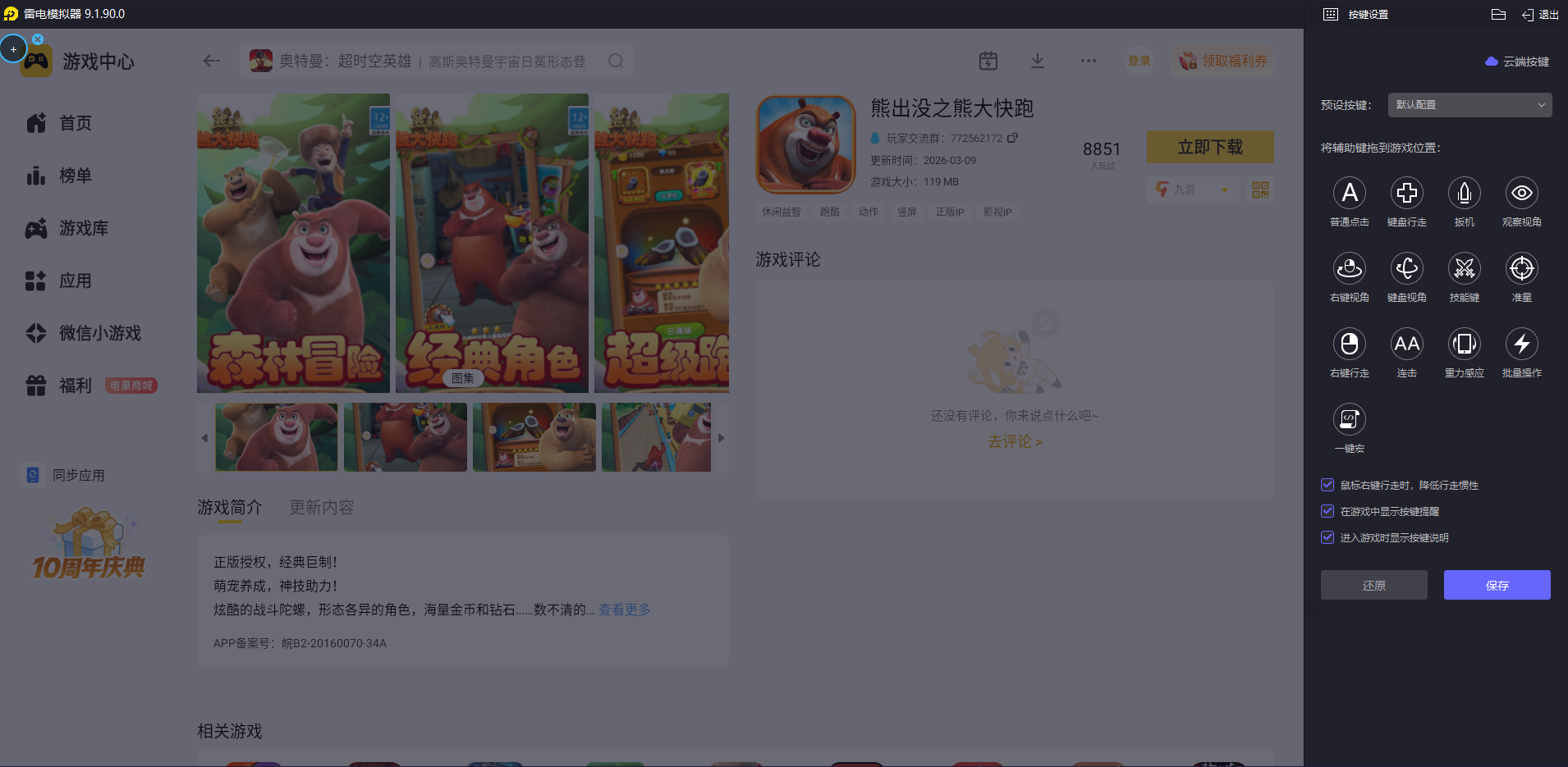 启动模拟器后,在内置的雷电游戏中心搜索“熊出没之熊大快跑”,找到对应游戏后点击下载,下载安装完成后双击图标,就能直接进入游戏游玩。