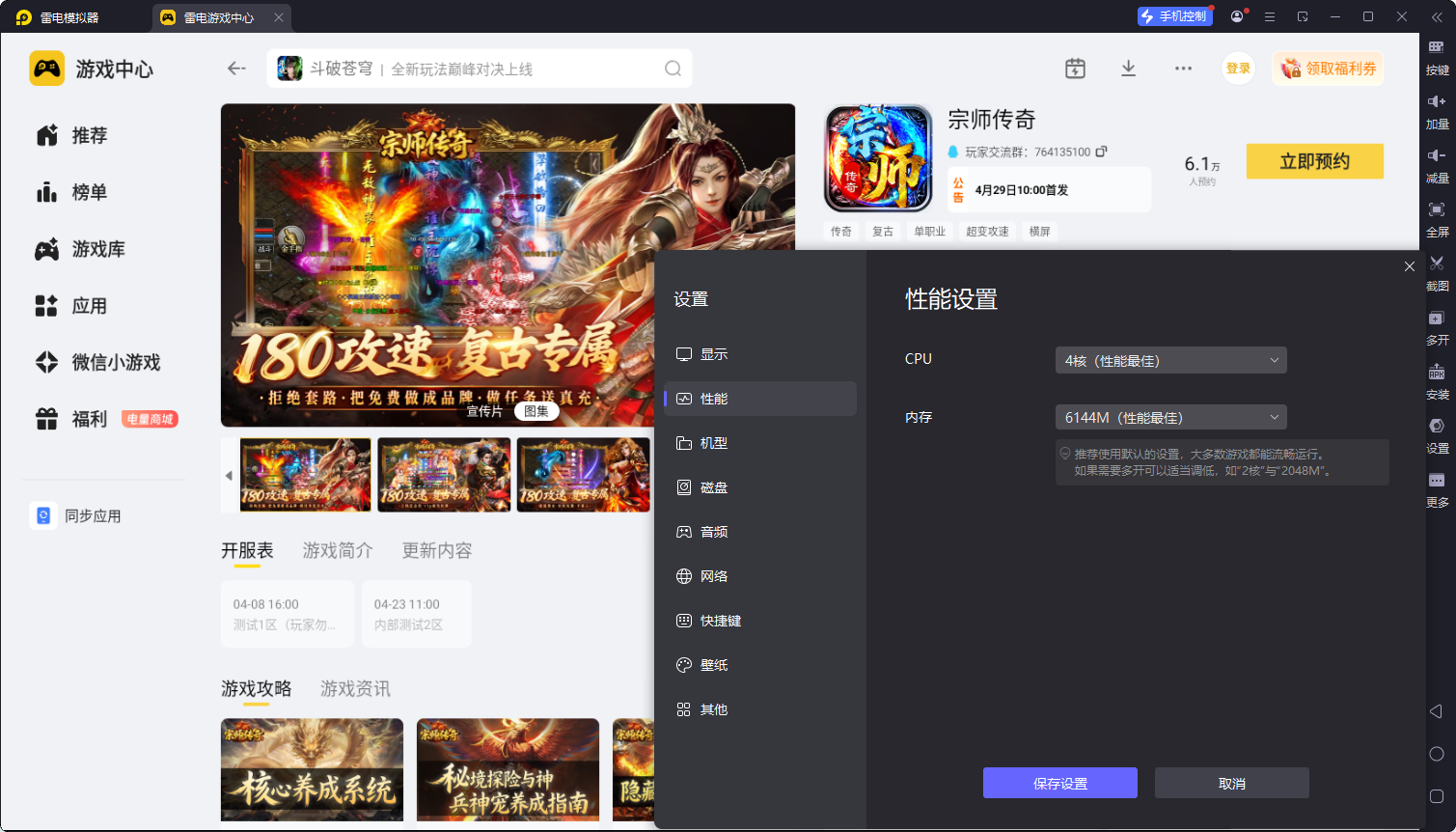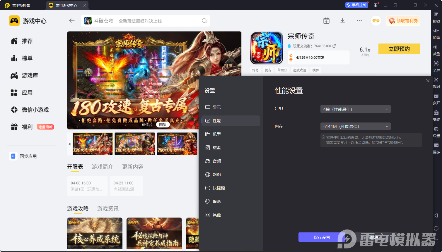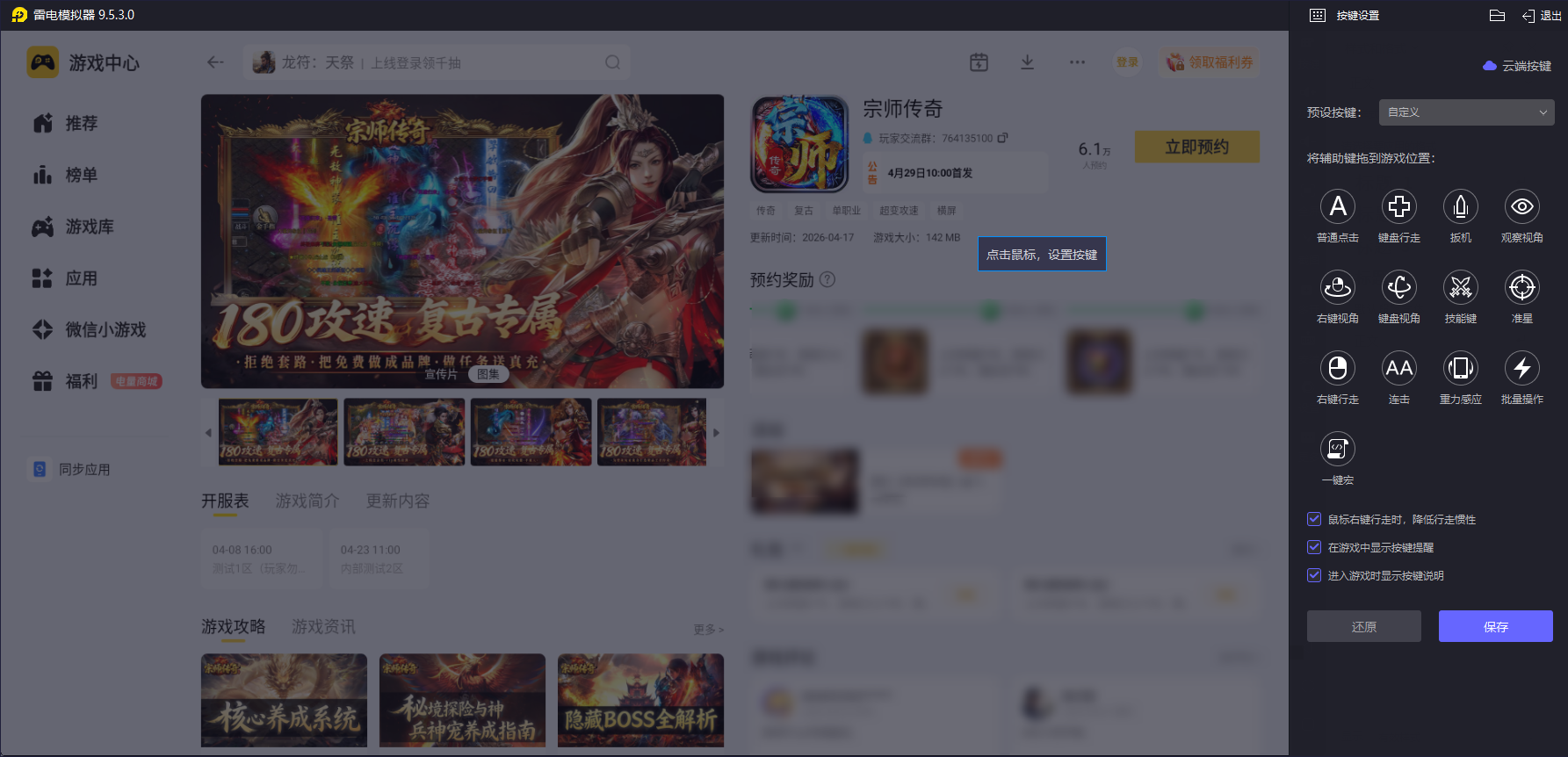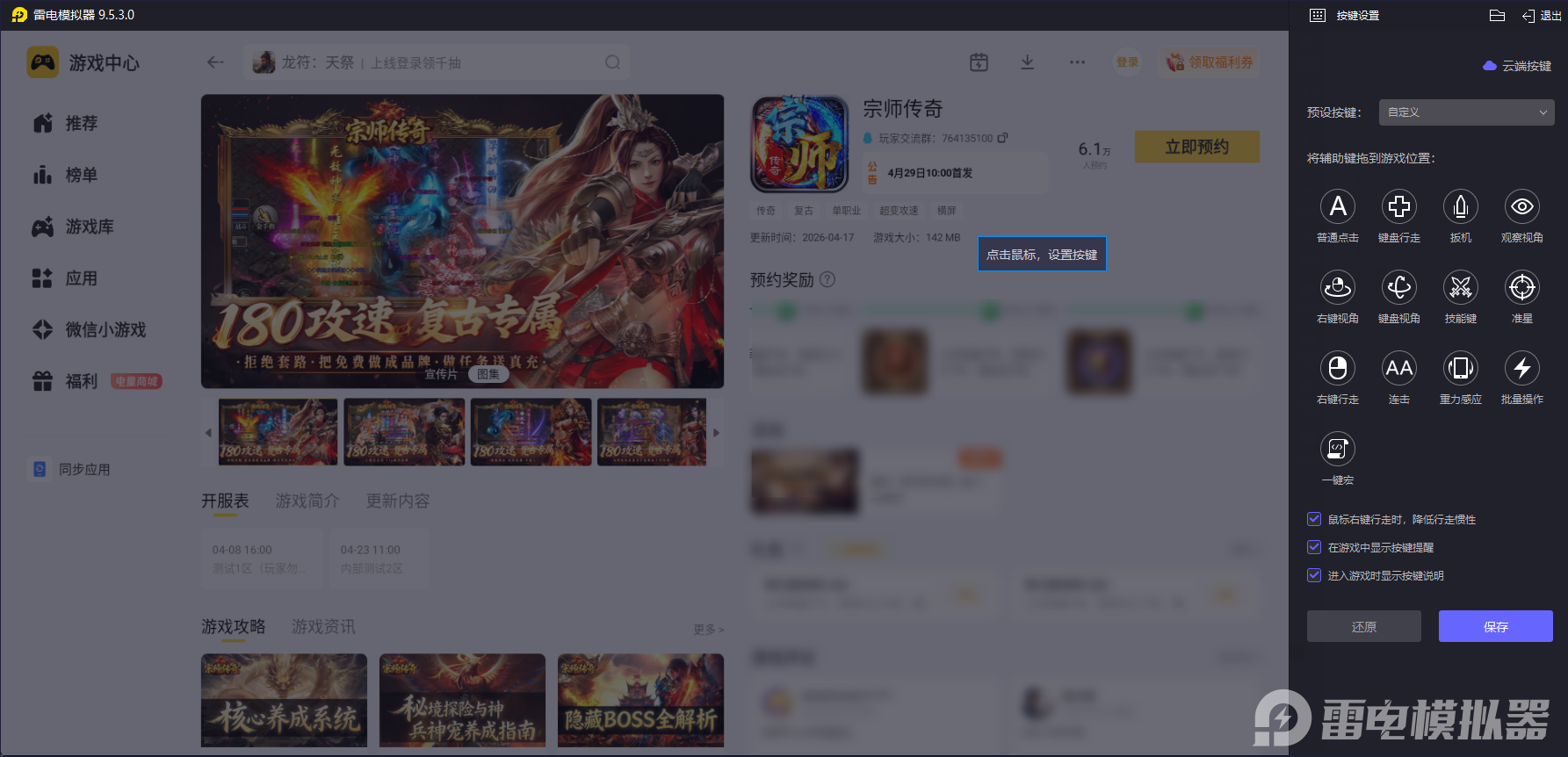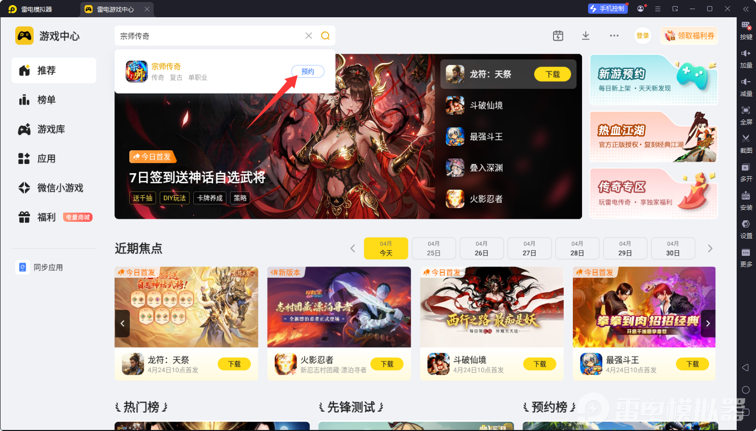 安装完成后启动雷电模拟器,进入内置的雷电游戏中心,在搜索栏输入宗师传奇模拟器,找到对应游戏页面后,直接点击“立即预约”即可完成操作,预约成功后,游戏上线时会第一时间收到通知,便于快速下载体验。