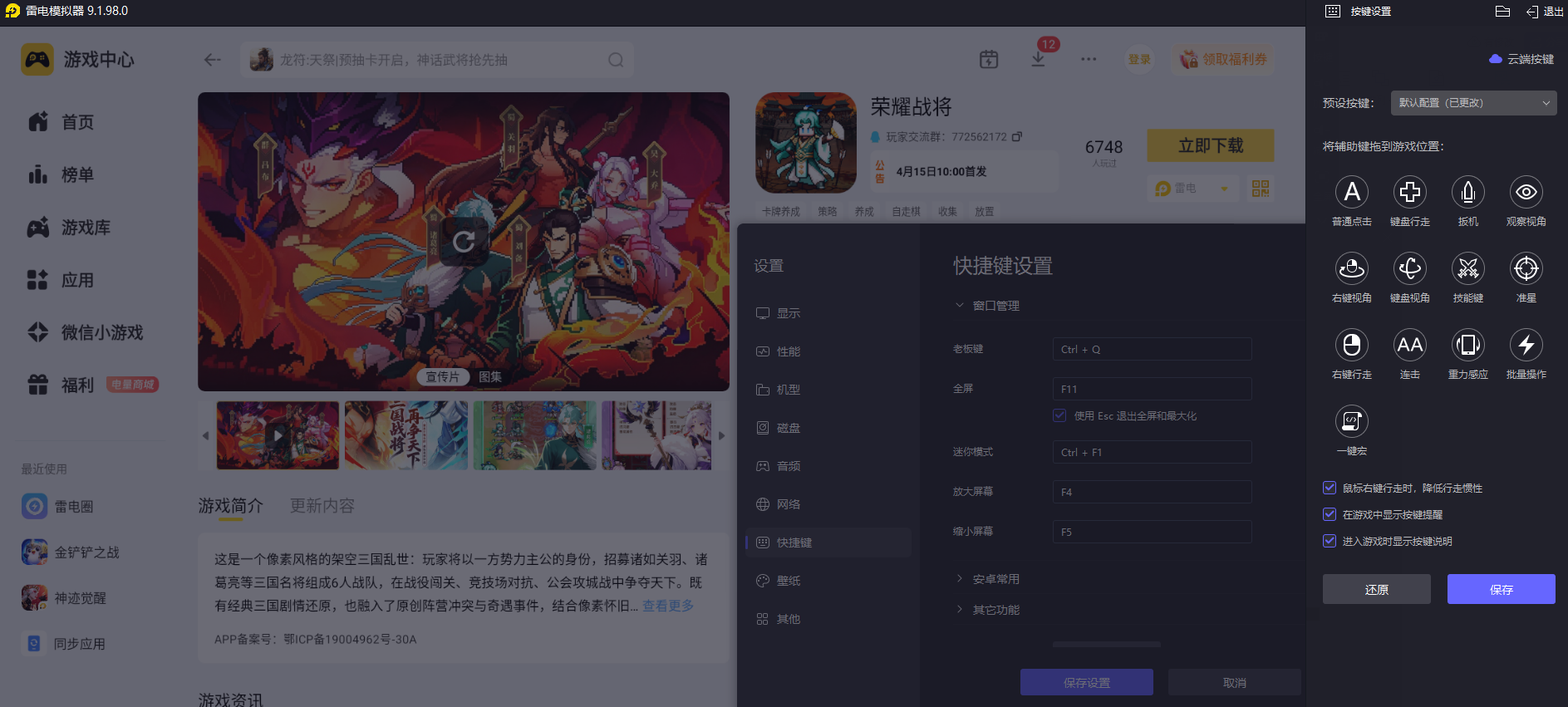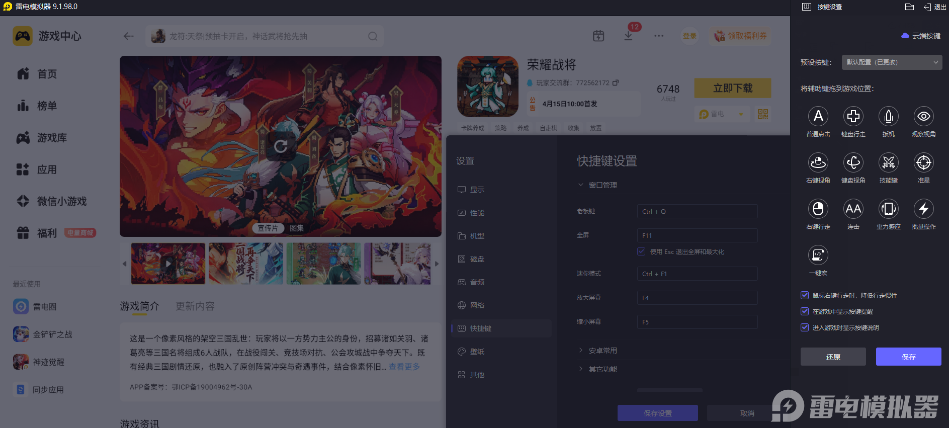 荣耀战将需要频繁调整战队布阵、切换武将阵容和解锁关卡进度,频繁点击屏幕调整阵容细节,雷电模拟器自带自定义键鼠按键设置功能,可以把布阵、换将、闯关等常用操作绑定键盘按键,精准完成每一步战术调整,操作操控更加精准顺手。