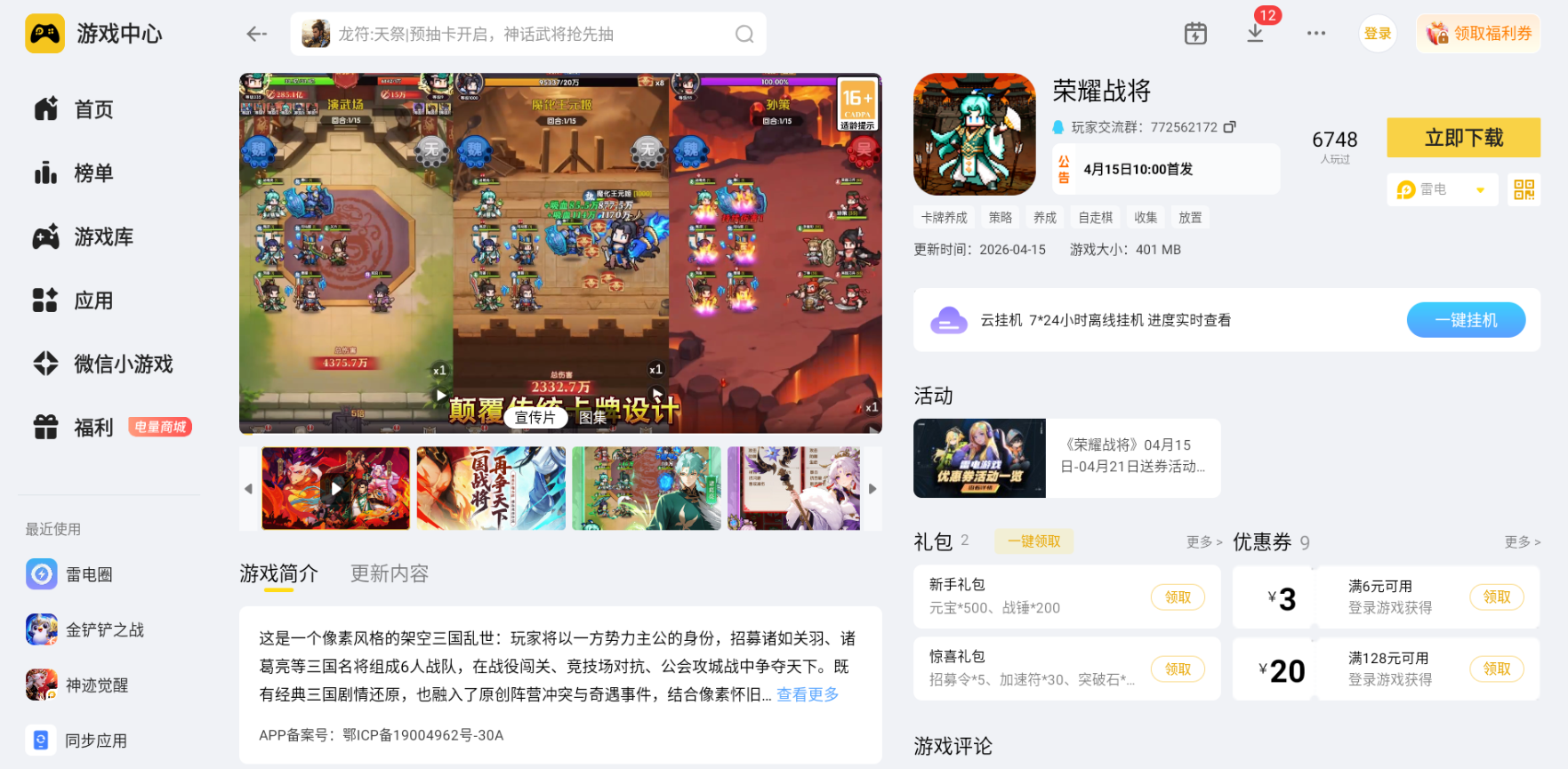 荣耀战将主打轻策略卡牌挂机对战核心玩法,内设四大武将阵营克制体系,玩家可以自由组建六人作战小队,调整前后排站位搭配不同武将羁绊,通过闯关刷取装备材料提升全队战力。结合这款游戏阵容搭配和持续养成的游玩特点,在电脑上用雷电模拟器游玩荣耀战将,能完美适配游戏各类操作和长期养成需求,游玩体验远优于手机端。