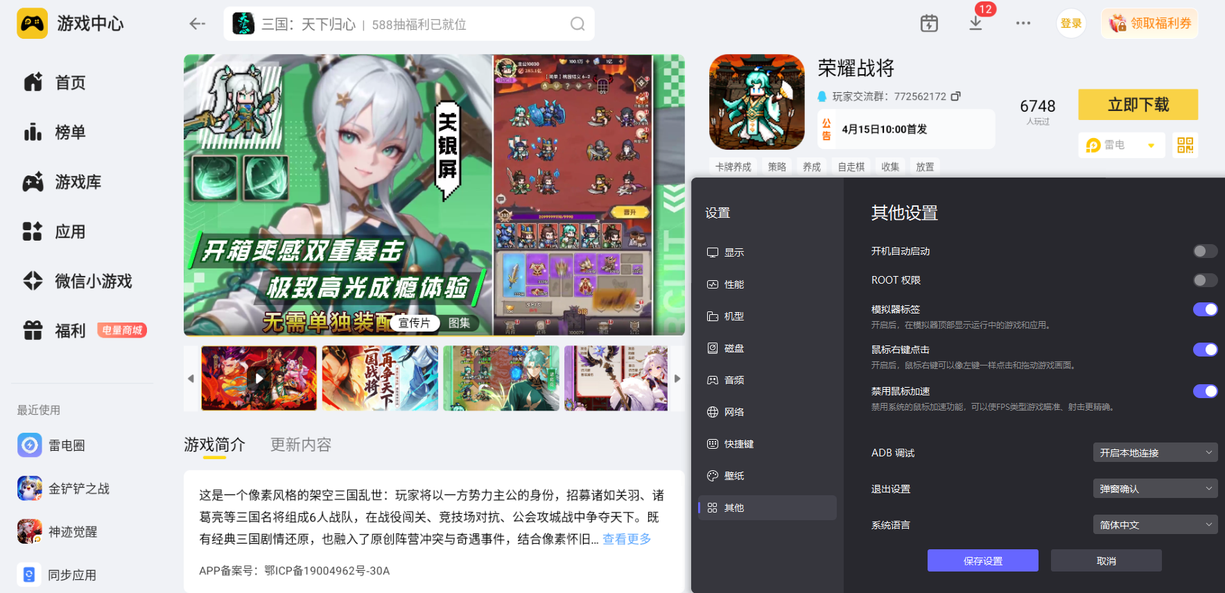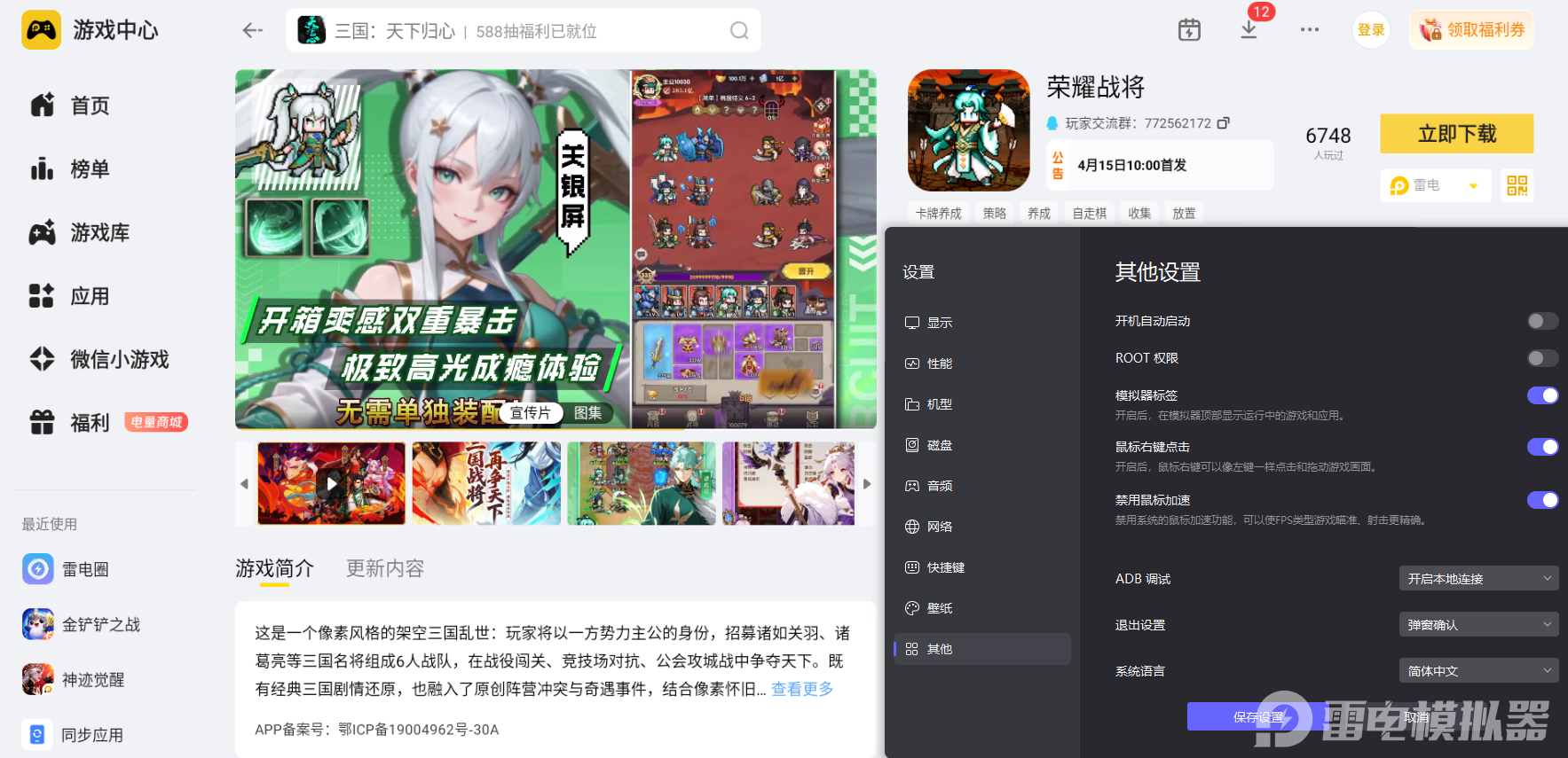 荣耀战将主打六人武将编队布阵,还有阵营克制搭配、关卡闯关和日常挂机养成等核心玩法,这个时候,选择在电脑上用雷电模拟器玩,就能告别手机小屏幕带来的视觉局限,电脑大屏能清晰看清全场对战布局和武将属性细节,模拟器适配电脑键鼠操控模式,调整布阵和切换阵容操作起来更加顺手,整体游玩体验会提升很多。